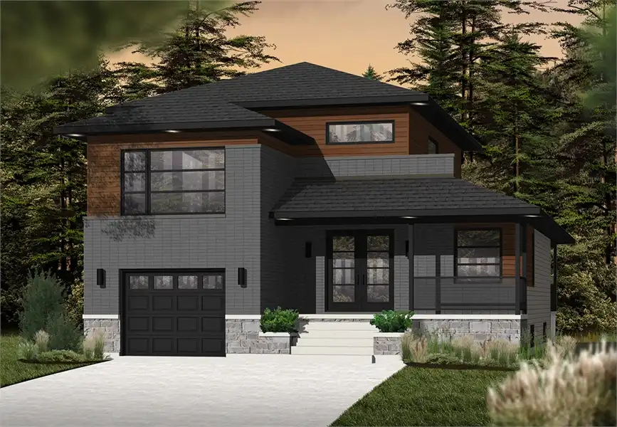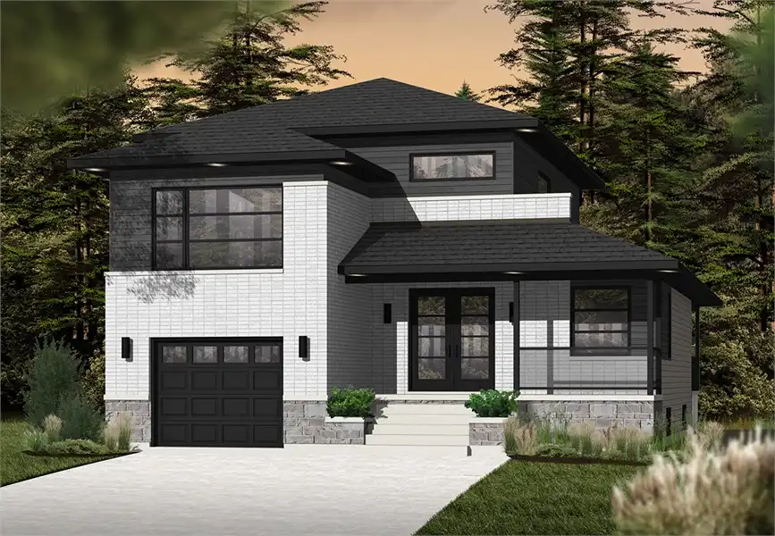 This up-to-date two-story home design exudes contemporary style. A den or home office is located near the front entry. The gourmet kitchen is sleek and efficient, and opens to a rear porch. A fireplace warms the versatile great room. Upstairs, the master suite boasts a sizable walk-in closet. A few steps up, a glass-block shower anchors the private bath. Two children's bedrooms are found on their own level, and share a split bath.