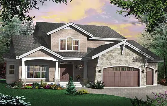 This beautiful Craftsman home plan is adorned with tapered columns and graceful arches. Double doors introduce the foyer, and the nearby office or den. The island kitchen serves formal or casual meals with ease. A two-way fireplace warms the spacious family room and the posh master bedroom. The stunning master bath boasts a fancy garden tub. All main-floor rooms are augmented by 9-ft. ceilings. Upstairs, a railed loft is great for chatting or reading. Three large bedrooms and two split baths complete the design.