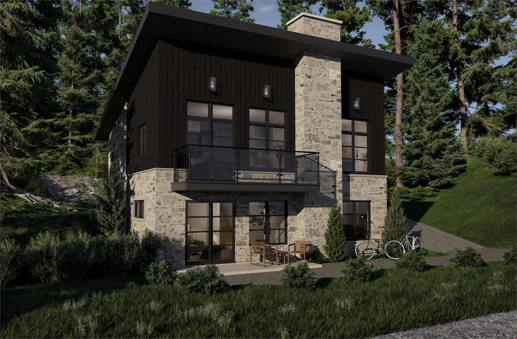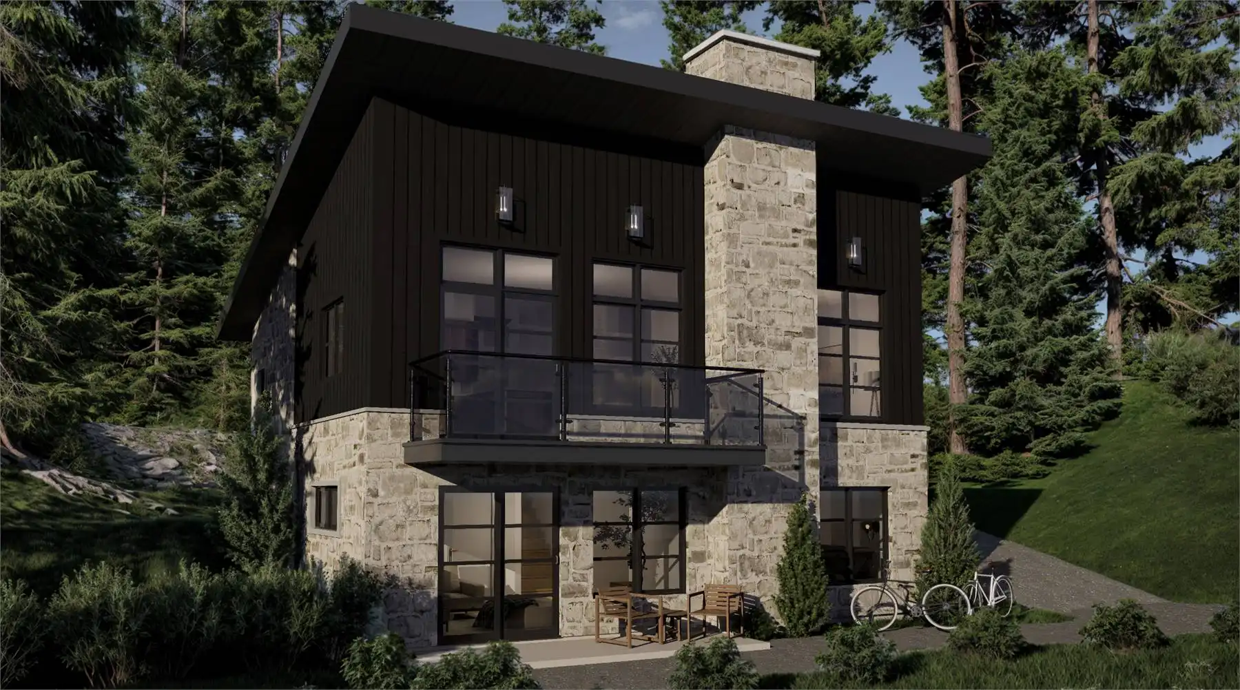 This modern style house plan provides all of the feelings and accommodations of city living, without any of the hassle. With the trendy look of a town home or metropolitan building, this 1,759 square foot home offers 3 bedrooms and 2 bathrooms of high-end living. The layout of this plan is conducive to family living. With a basement level that is home to 2 bedrooms and a sitting area, and a main floor that has a sizeable living room and kitchen. The main floor even offers a balcony area and a patio sitting space below. Both floors have a large bath tub and shower area in their bathrooms for easily accessible comfort.