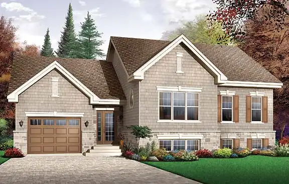 Shingle siding, stone and shutters give this one-story home design a lovely facade. You'll be proud to welcome friends into your sidelighted foyer. The island kitchen and versatile dining room are visually expanded by an 11-ft. ceiling. The living room lies five steps up, with great views of the front yard. Two bedrooms share a spacious hall bath, complete with a garden tub. A bonus room above the garage can be accessed via a retractable staircase.
