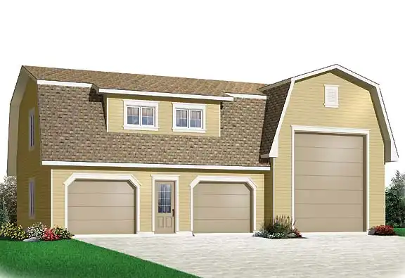 Enhanced by shed dormers and Dutch gambrel rooflines, this attractive garage accommodates two cars and one RV in style. The RV space can be lengthened if required. A flexible bonus space lies above the two cars.
