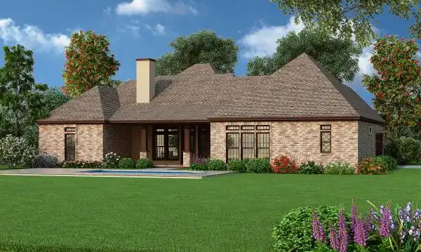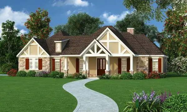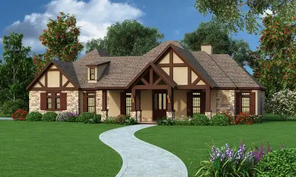 A marvelous medley of rustic and Craftsman styles creates the unique facade of this Tudor-inspired home. But the exterior is just the beginning of all the 2,342 square foot stunner has to offer. An interior with a ranch-style layout creates the perfect space for a family that is growing and needs space but also wants to feel together and comfortable. And with up to 4 bedrooms, the plan can do exactly that. Check out the common areas such as the living room and island kitchen. For entertaining, there is a covered back deck and a formal dining room. And for relaxing, be sure to explore that master suite. Beyond having dual walk-in closets, there are also separate his and hers full bathroom suites. This creates the ultimate privacy and relaxation potential! There is also the option to add a full basement level if your lot allows for it.