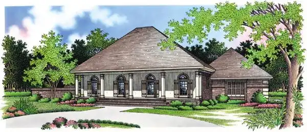 Except for the porch areas, this well-balanced traditional design is finished with no maintenance brick veneer. It is also a super energy saving plan featuring 2x6 exterior walls. The kitchen is angular to take advantage of the rear views and is open to the bay eating area and liberal sized living room. The formal parlor is open to the living area or it can be used as an optional bedroom by relocating the door to the hall. The master suite features private access to the rear covered porch, sitting area and a plush bath with twin giant size walk-in closets and a corner quarter circle whirlpool.