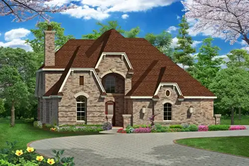 This lovely two-story home design portrays a certain European flair. Inside you'll find three bedrooms, each with direct access to a bath. The master suite is opulent yet comfortable, with a garden tub and a sprawling wardrobe. Friends will gather near the corner fireplace in the spacious family room. The island kitchen serves any meal in style. The upper floor will entertain you, with its media room, game room and card area. See Austin Ridge or Austin Valley for alternate elevations.