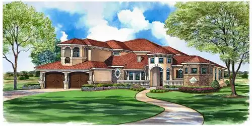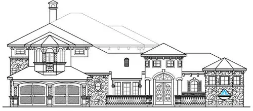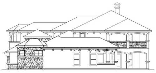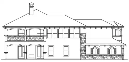 Arches and stucco lend a Tuscan feel to this terrific three-bedroom home design. Two lovely verandas seem to welcome guests into the unusual foyer. The dining room makes visitors feel important. The fantastic kitchen offers an angled serving bar. The family room and an outdoor lounge include back-to-back fireplaces. Invite friends to stay overnight in the well-appointed guest suite. Two more fireplaces enhance the master suite's bedroom and bath. A wet bar lets you enjoy a nightcap before turning in. Endless fun awaits you on the upper level, with its balconies, game room, tech corner and media room. A secluded bedroom suite rounds out the floor plan.