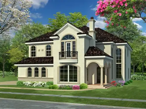 This lovely two-story home design boasts a Mediterranean feel. Inside, high ceilings enhance the foyer and living room. The island kitchen serves any meal with ease. Fireplaces warm the family room and study. Upstairs, the master suite is a complete retreat, with a lounge area, a sleeping chamber, and a posh private bath. Host a bridge tournament in the game room, complete with a refreshing wet bar and a handy powder room.