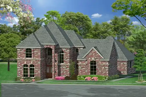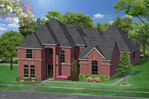 Arches and keystones give this three-bedroom home plan a French feel. Inside, double doors introduce a vaulted study. With a crackling fireplace, the central family room is perfect for any gathering. The secluded master suite flaunts an oversized sleeping chamber and a posh bath. Upstairs, a railed loft is a nice place for games or conversation.