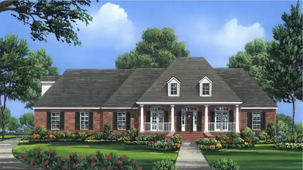 This Southern country-style house design has a bit of a French feel. Inside, a cathedral ceiling presides over the ample Great room. The island kitchen serves any meal or snack with ease. Relax in the posh master suite after a long day at work. Bedroom 4 would make a nice suite for in-laws or guests. A bonus room above the garage would make a perfect hobby room.