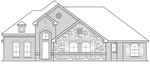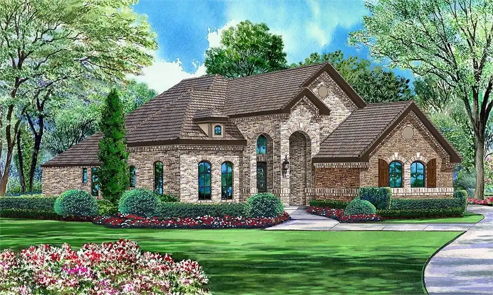 You'll love the repeated arches of this one-story luxury home plan. Inside, the open floor plan is great for entertaining. Double doors introduce the peaceful study or home office. A fireplace warms the spacious family room. The master suite is a relaxing haven, complete with a deluxe bath. To the left of the island kitchen lies a bedroom that would be perfect for guests or in-laws. The side-entry garage keeps the front yard beautiful and uncluttered.
