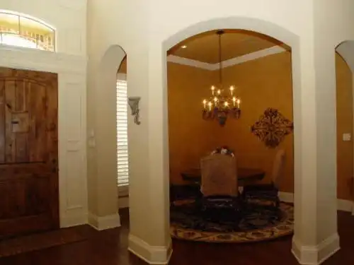 Arches, stone and brick dress up this two-story European house plan. Inside, double doors introduce the study, with its circular sitting area. The nearby dining room will treat your guests in an appropriately distinguished manner. The island kitchen serves casual meals in the circular breakfast nook. A fireplace warms the living room, which hosts any gathering in style. It's hard to choose a highlight in the posh master suite, because there are so many. How about the sitting area or the garden tub? More bedrooms and entertaining spaces are found on the upper floor, along with a bonus attic storage area.