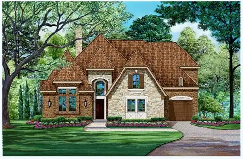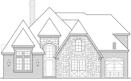 This European-inspired house design is adorned with stone, brick and arches. Off the foyer, Bedroom 4 would be perfect for guests or in-laws. Double doors introduce a spacious study or home office. The dining room is elegant enough to impress your dinner guests. Gather friends in the family room for a game of charades. Then enjoy hot chocolate in front of the crackling fireplace. The kitchen is open and friendly, ready to serve hors d'oeuvres on the oversized island. You won't find a master suite with more class than this one. The deluxe bath boasts a garden tub. Host a poker party in the upstairs game room. Then step into the media room for the latest popular flick.