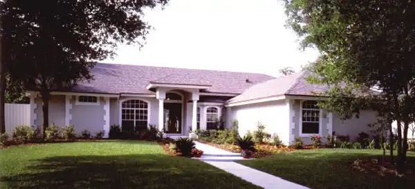 The designer of this three-bedroom house plan included a large family room, to foster family togetherness. You can entertain guests in the formal dining room and the lovely living room. A covered patio is brightened by skylights. The island kitchen flows into the casual breakfast nook. The master suite is elegant and peaceful. A bayed garden tub anchors the deluxe private bath. Two secondary bedrooms share a split bath. A den/study would make a great home office or extra bedroom.