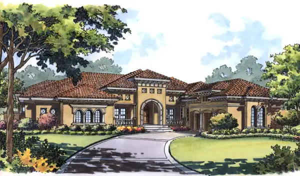 Repeated arches and a tile roof give this four-bedroom house plan fabulous curb appeal. Inside, the spacious family room is perfect for any gathering. Expand the party to the covered porch with fireplace and summer kitchen. The dining room and study are elegant spaces. The island kitchen flows into the bayed breakfast nook. The kids will appreciate their bedrooms, with private baths and walk-in closets. Another bedroom suite lies above the garage. Across the home, the master bedroom offers porch access. Through a kitchenette, double doors introduce the posh bath with amazing tub and shower. The home theater also has a kitchenette, to serve tasty snacks.