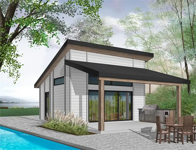 This pool house plan or cabana plan, offers several possibilities! In this plan you will find additional living and storage space. This new cabana, offers several conveniences not to be passed over in silence, like its large covered terrace. The latter is large enough to hold a kitchen area with BBQ, sink and refrigerator. In addition, an outdoor dining area, with enough space to accommodate a table of 6 to 10 people. A television could even be installed outside. Large lounge furniture could replace the table to provide a nice guest sitting area. The interior of this pool house offers a small kitchen with dishwasher, storage and sink. A small lounge is fitted with television but could also easily be converted into a small indoor dining room or bar corner. Triple patio doors makes for easy access between people outside and inside, as well as plenty of natural light. A versatile room is proposed, with access to the outside by the back. A shower room with vanity and toilet, and convenient access to the outside, completes this new pool house plan or cabana plan!
