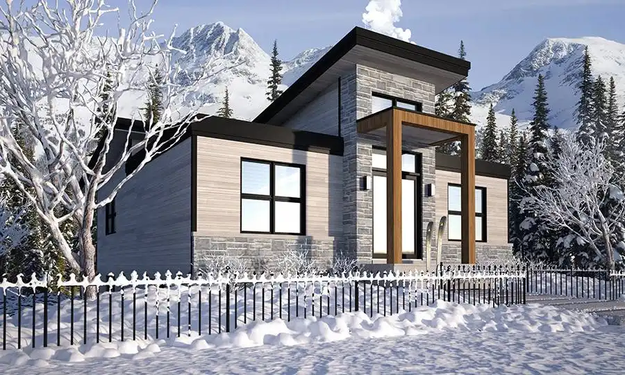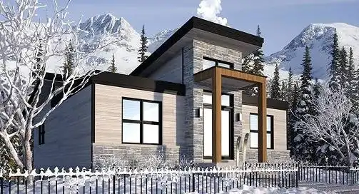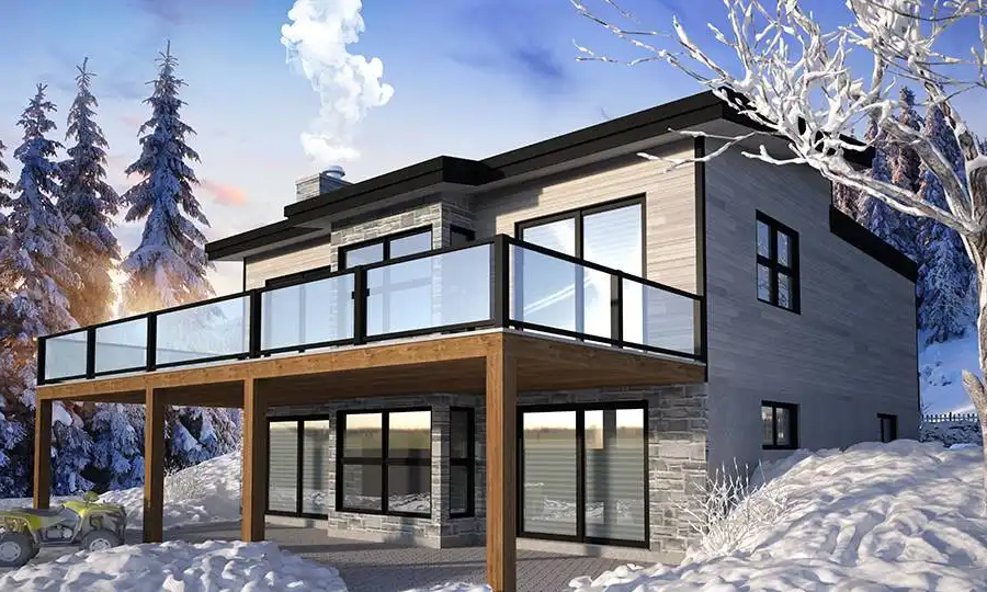 Modern Cottage plan with a large rear terrace.  4-bedrooms and 3-bathrooms, make this home a great size for a growing family. There are 9' ceiling on main floor. Modern Cottage house plan with finished walkout basement. Total of 4- bedrooms and 3 bathrooms. Large rear deck 36'8'' x 14'0''. Kitchen island for 5 guests and pantry in kitchen. Kitchen, dining and living room open concept. 9' ceiling on main floor. Living room and family room with fireplaces. Lots of natural lights on both floors.