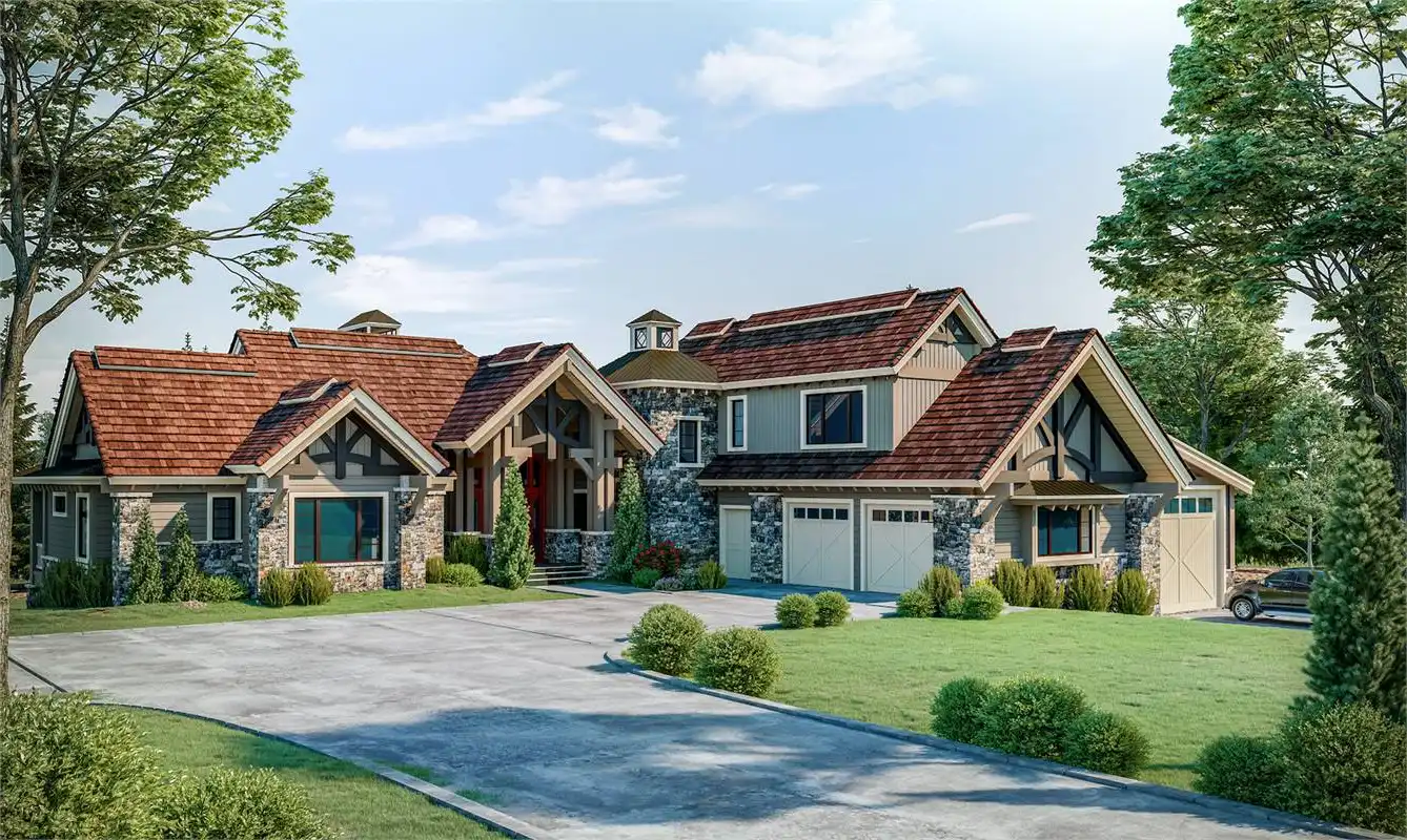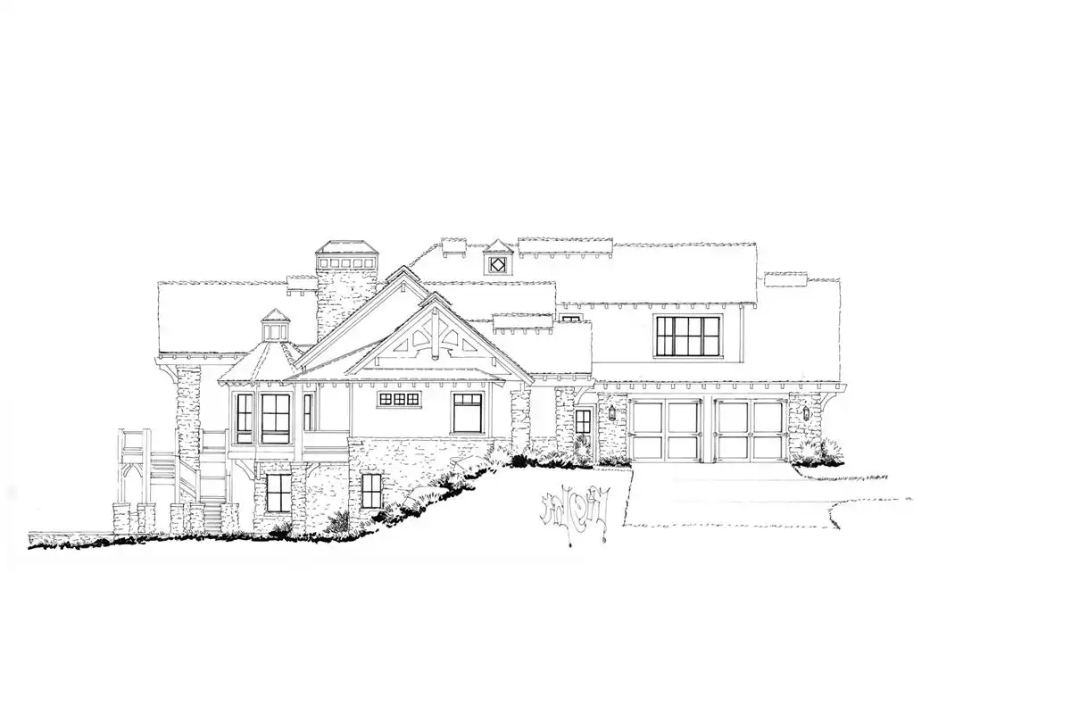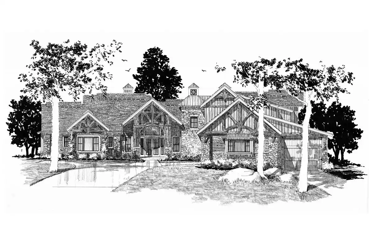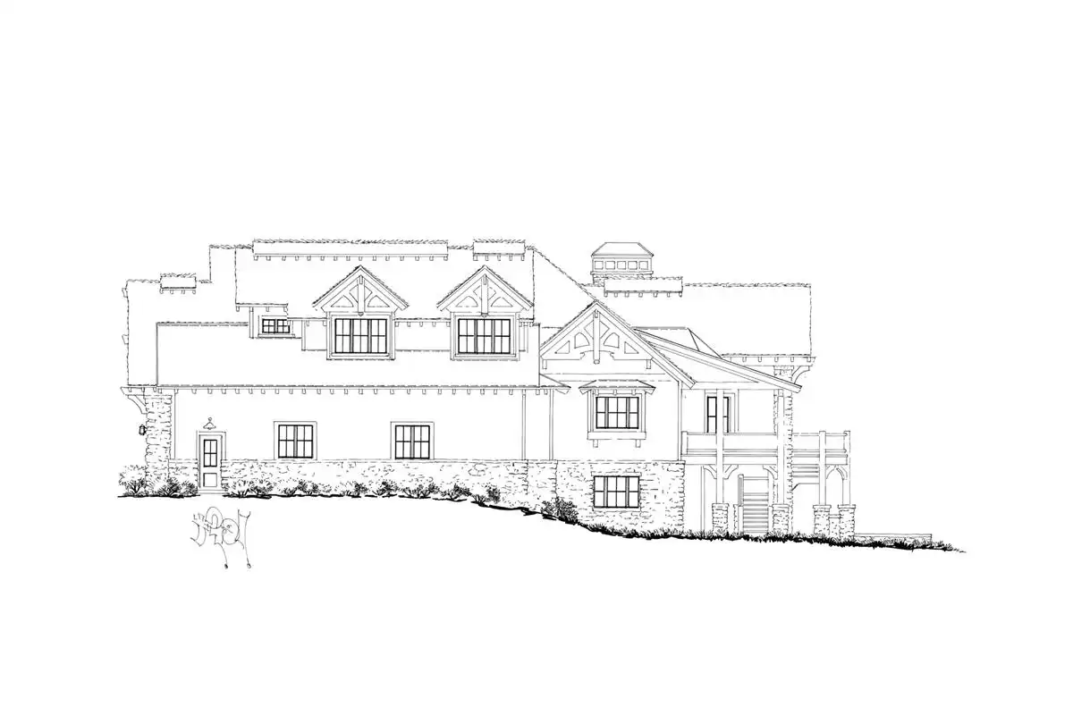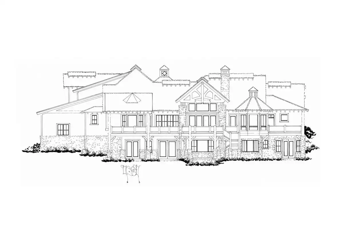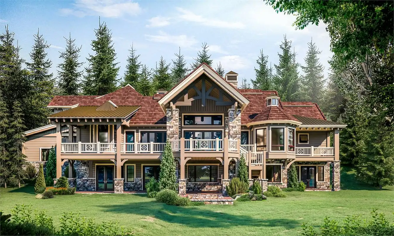 Fall in love with the stone and wooden accents in both the front and rear of this luxury rustic mountain house plan. You'll see the lovely balconies on the upper level. A plan such as this one is 6,630 square feet, has six bedrooms, six bathrooms, and two powder rooms. Enjoy the large kitchen featuring an island, a wonderful gathering space. The outdoor living area has access to a fireplace, perfect for cool nights. On the main floor is where you'll find the master suite with a dreamy bathroom with a soaking tub! All other bedrooms exist throughout the main, upper, and lower levels. This luxury open floor plan features a game room, a family room, an office, a media room, a storage unit, and a mechanical room. This spacious home has a three-car garage and an extra RV garage!