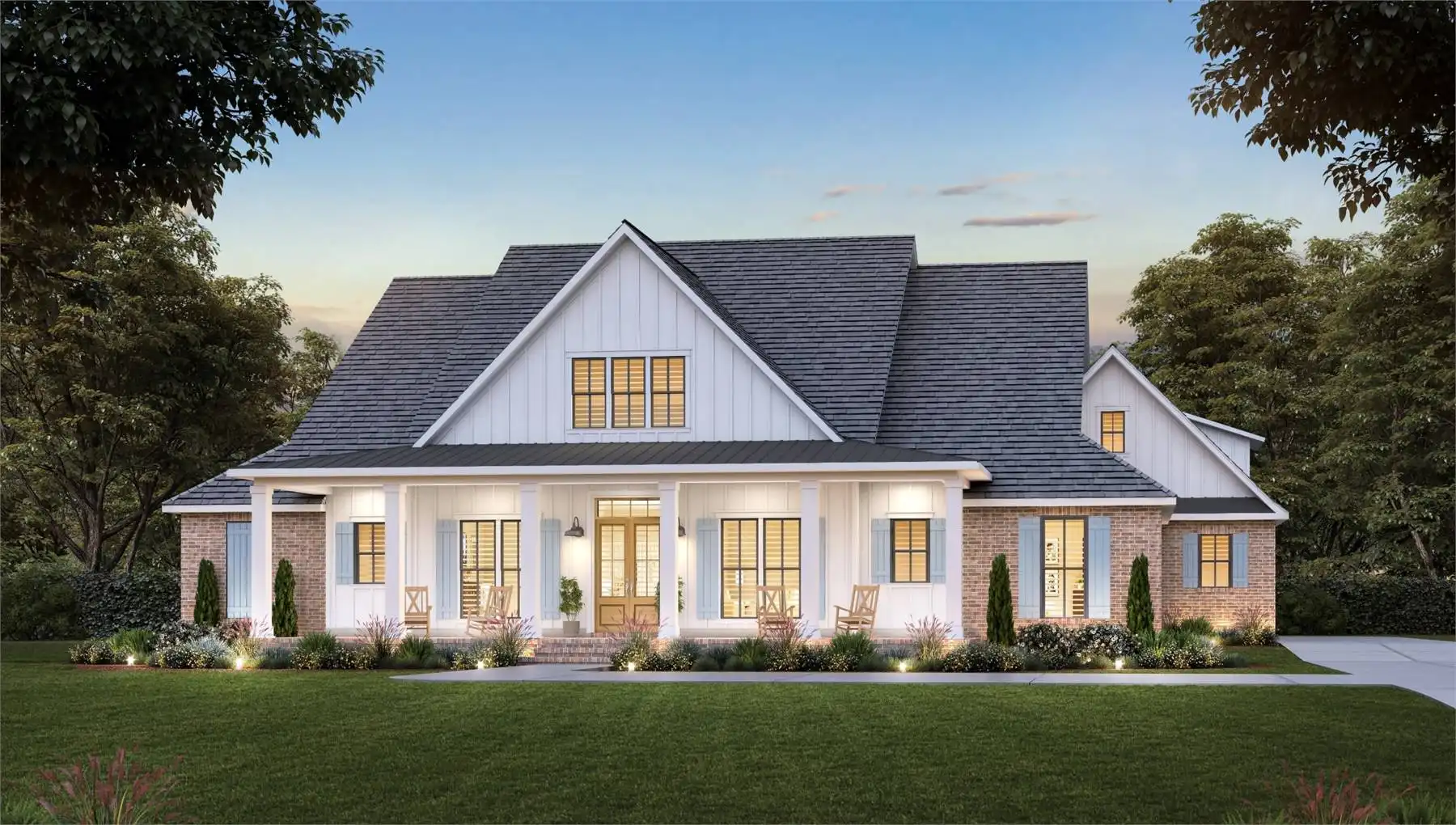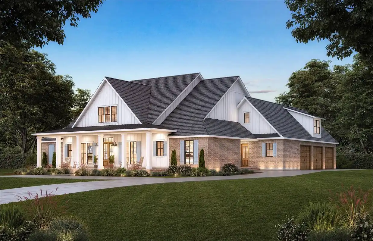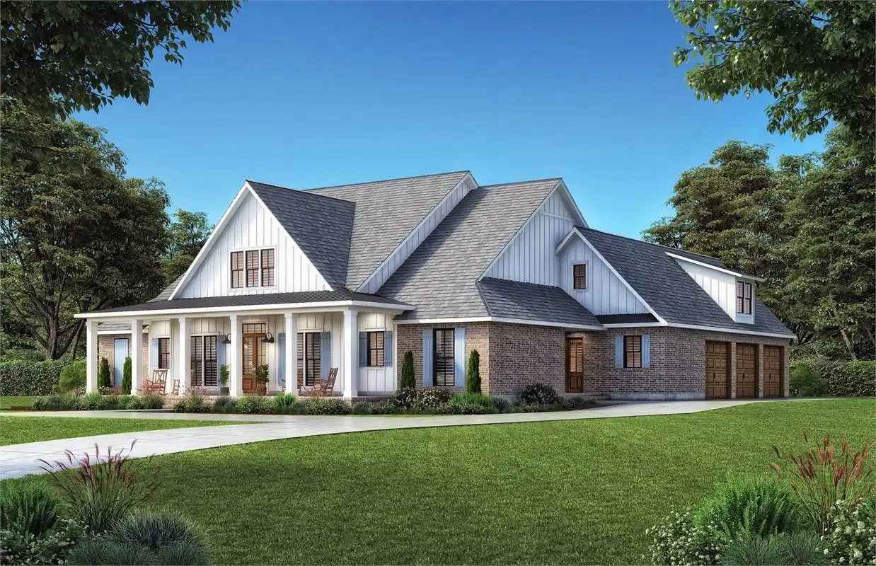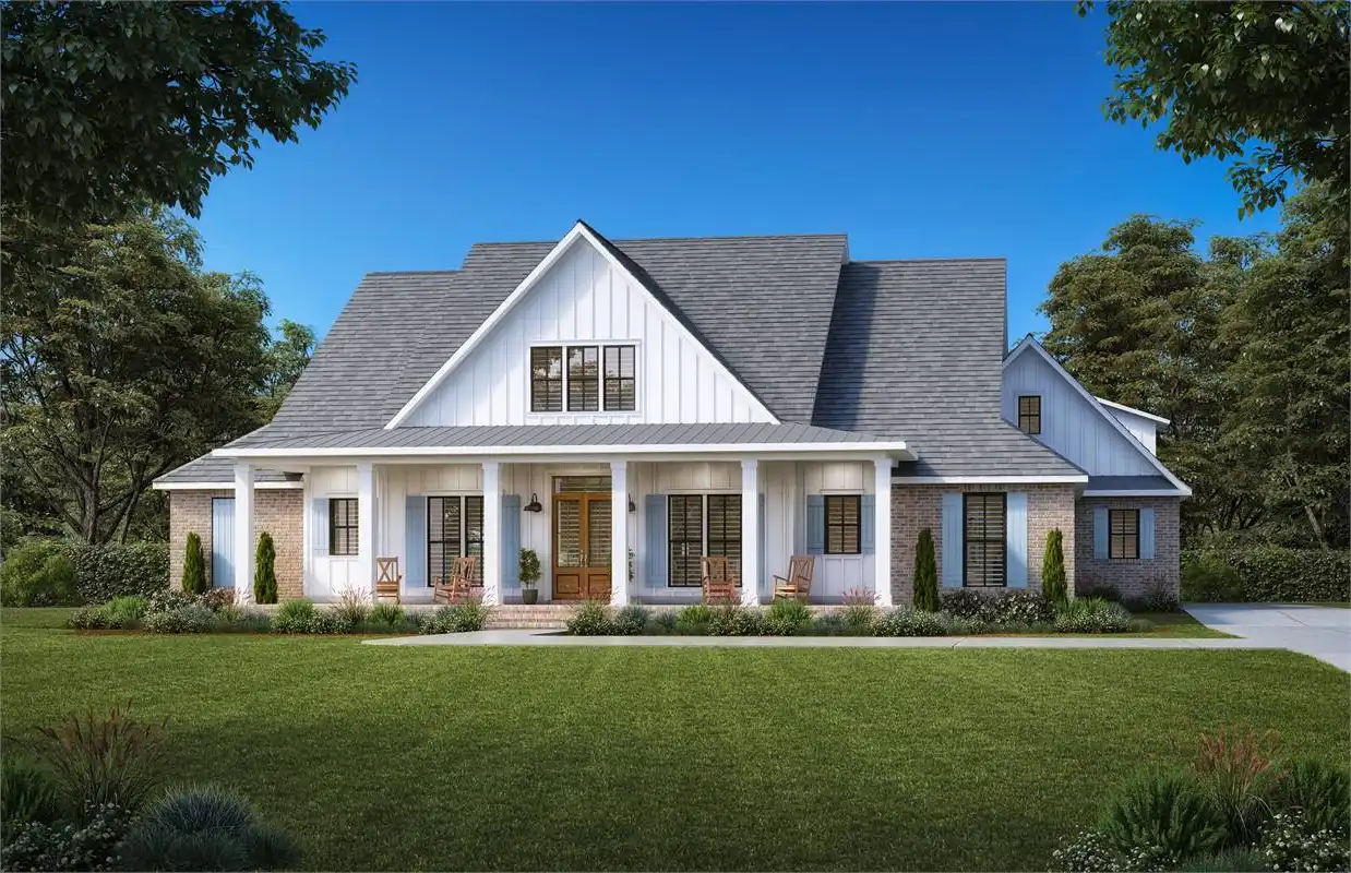 House plan 5005 is a 4/5 bedroom, 3.5 bathroom, 3,449 square foot plan. The kitchen is open to the great room and dining room providing great space for entertaining guests. A large island provides additional meal prep and seating areas. The master suite is on the main level with a beautiful garden tub, separate shower, double vanity sink area, and his/her walk-in closet. A covered front porch is a perfect place to enjoy morning coffee, then in the afternoon head towards the rear porch to enjoy a summer BBQ with the outdoor kitchen. The 3 car garage is perfect for vehicles and the extra storage you need. This beautiful farmhouse plan is perfect for any family.
