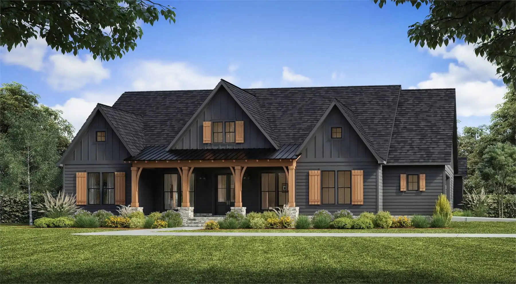 House plan 5006 is an amazing 2,928 square foot country farmhouse that has plenty of style and charm. The exterior of the house features a distinct siding and a large front porch with pillars to make it more inviting. When you enter this home, you're instantly greeted by a foyer that takes you to the great room, the focal point of the home. The kitchen is conveniently located close to the great room and is open to it, making it a great place for entertaining. The master suite is also located on this level and comes complete with a luxurious bath that has both a tub and a shower stall. A second and third bedroom with its own bathroom is on this floor as well. The rear porch and outdoor kitchen allow you to enjoy the outdoors all year long.