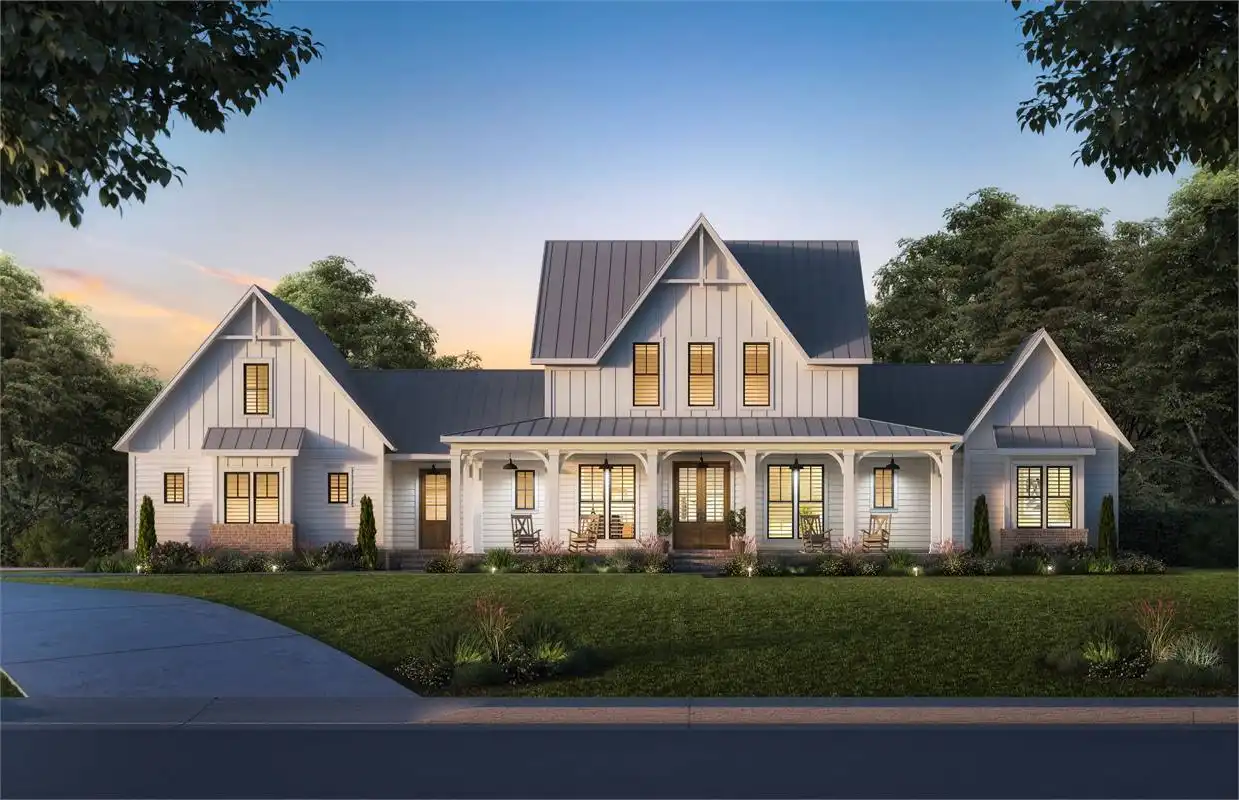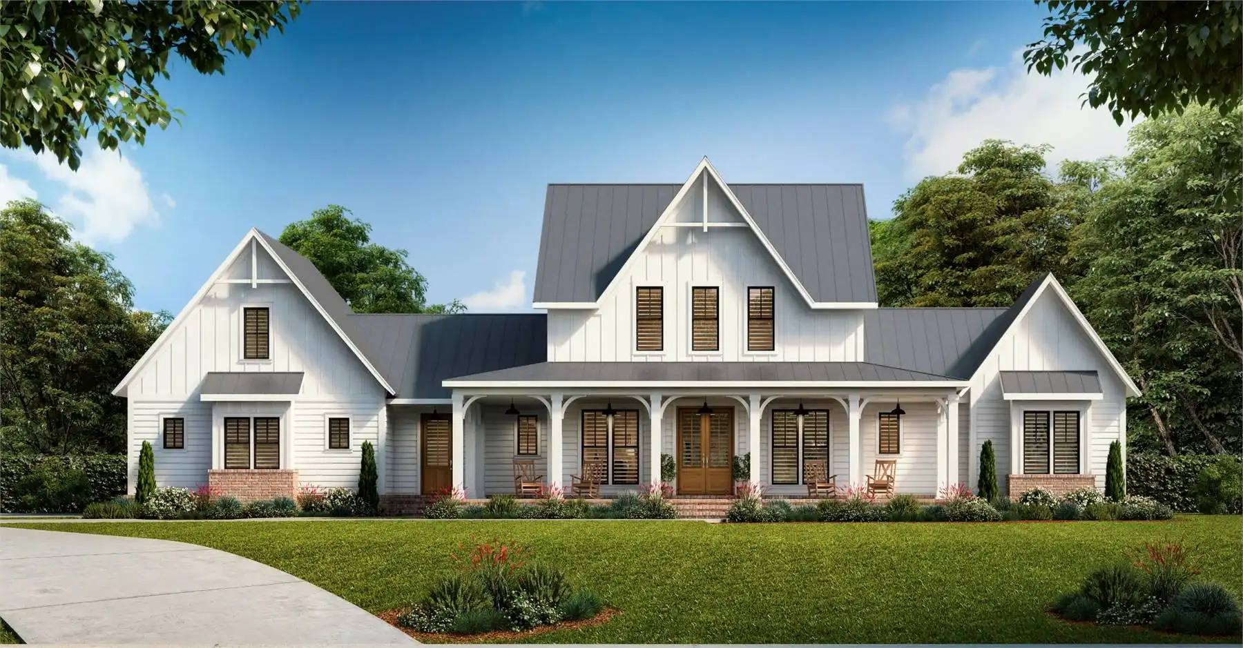 House plan 5008 is 2,705 square feet with 4 beds and 3 full baths. The country farmhouse plans boast a convenient main floor laundry room and an open floor plan perfect for relaxing! The large eat-in kitchen is right off the great room which makes it easy to get in and out of while entertaining. The kitchen features include a walk-in pantry with barn doors, a large island with seating for 5, plenty of storage space, and convenient access to both great room and rear porch for entertaining made easy! The impressive master bedroom features a vaulted ceiling with a sitting space, walk-in closet, and master bath with double sinks, a separate shower, and a large tub. Don't worry about having to keep your house clean with the mudroom located right off the garage and side entry porch. House plan 5008 is the perfect plan for the family who likes to entertain and spend valuable time with friends and family.