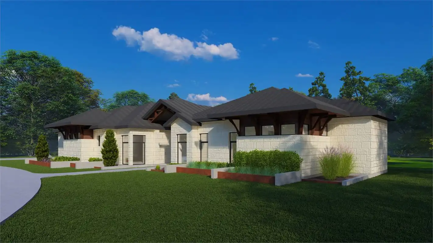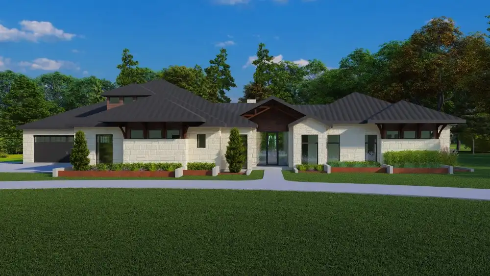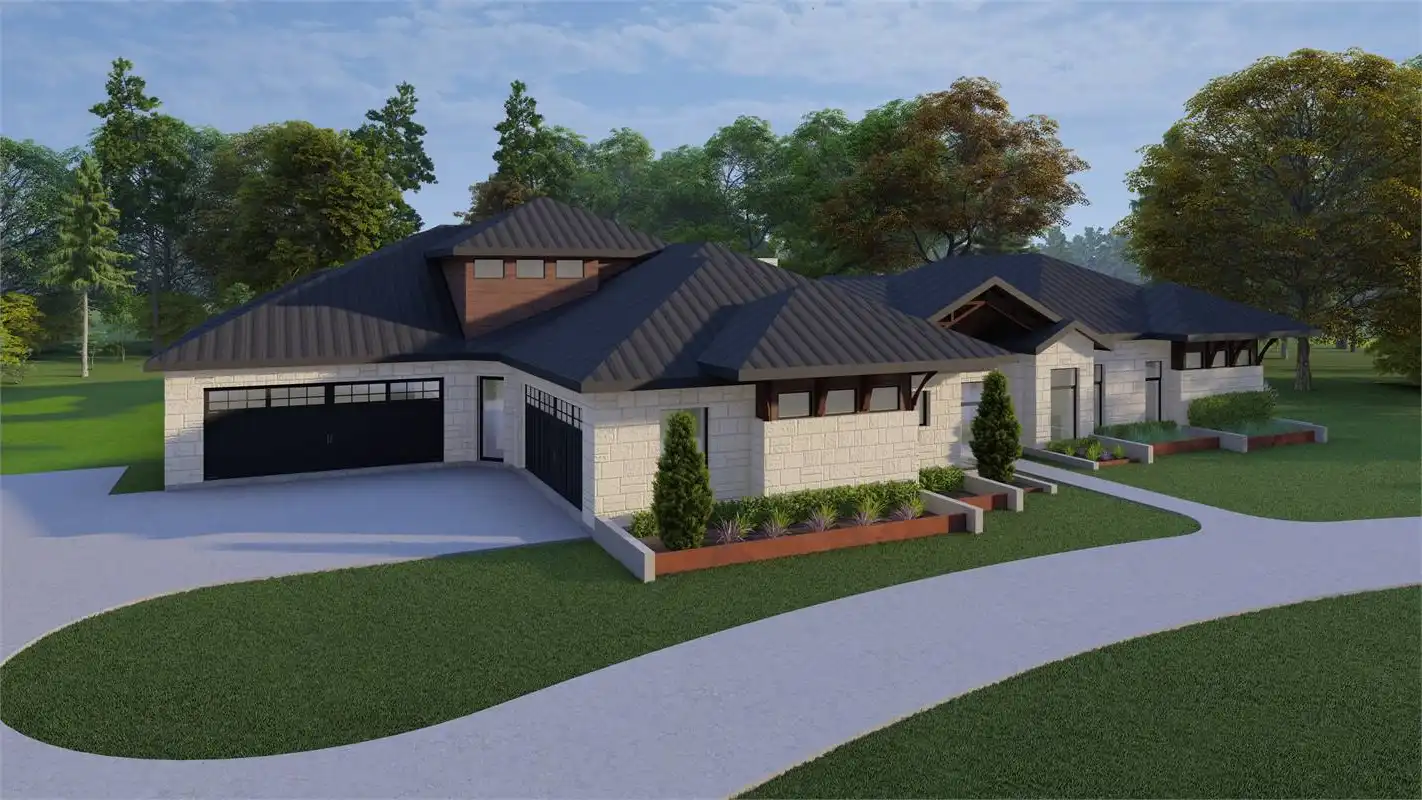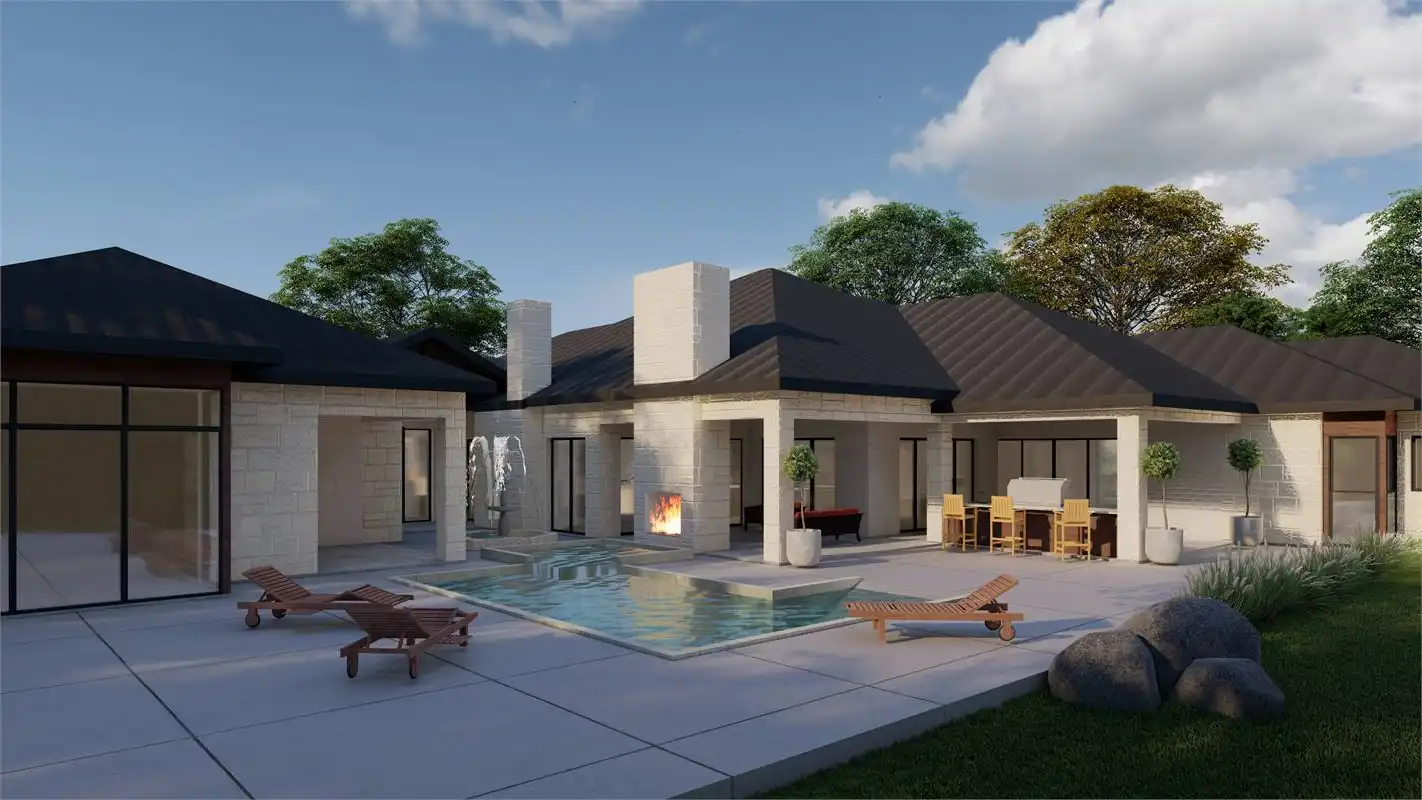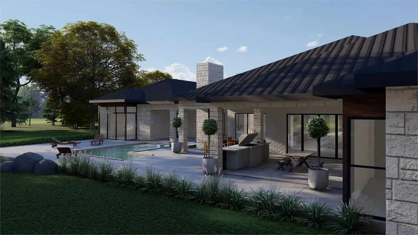 There are so many amazing features and styles packed within the walls of this sleek modern ranch plan. 5 bedrooms, each with their own walk-in closet and private en-suite bathrooms is only the start of all the 5,161 square foot design has to offer. Throughout the open rooms and brightly lit passageways, you'll notice a focus on bringing the whole family together. Whether that's in the large family room, private movie theater, or enjoying a dinner in the gourmet kitchen or outdoor grilling station, the options are virtually limitless. And with the convenience of spaces such as the 2 2-car garages or the customizable bonus room, you can make sure this home is fully ready for all of your needs. Plus, you can end each day with ultimate relaxation thanks to the stunning master suite, complete with a resort-style spa bath and dual walk-in closets!