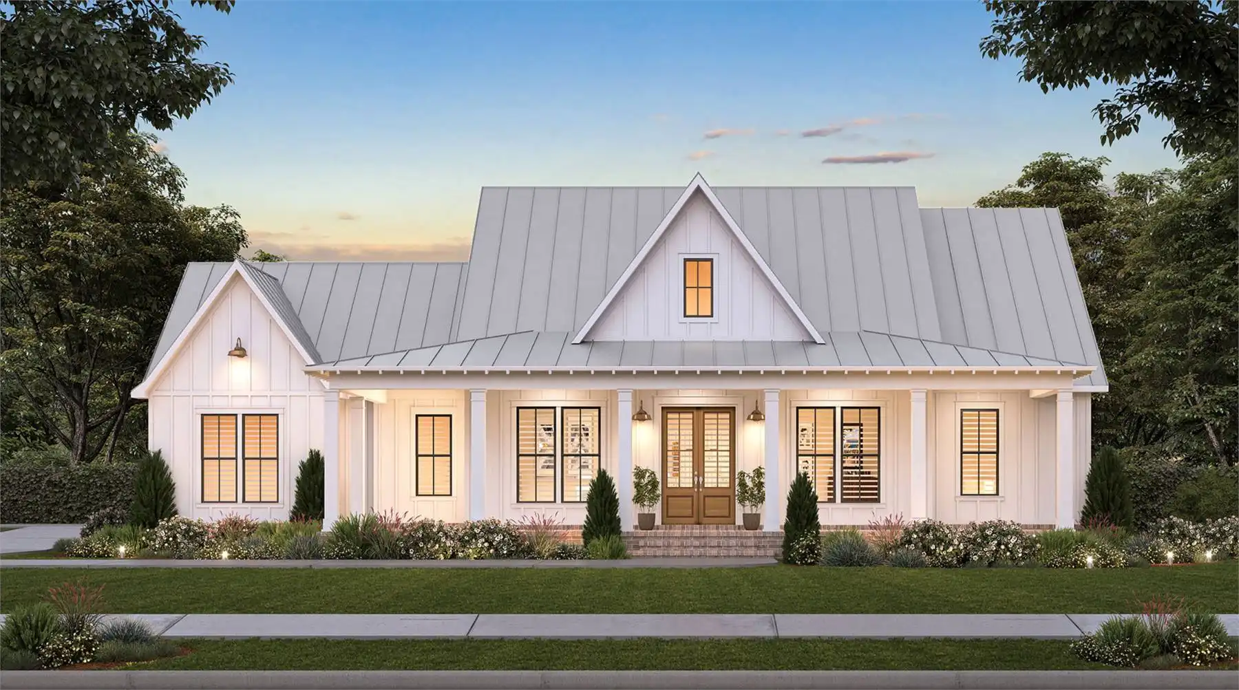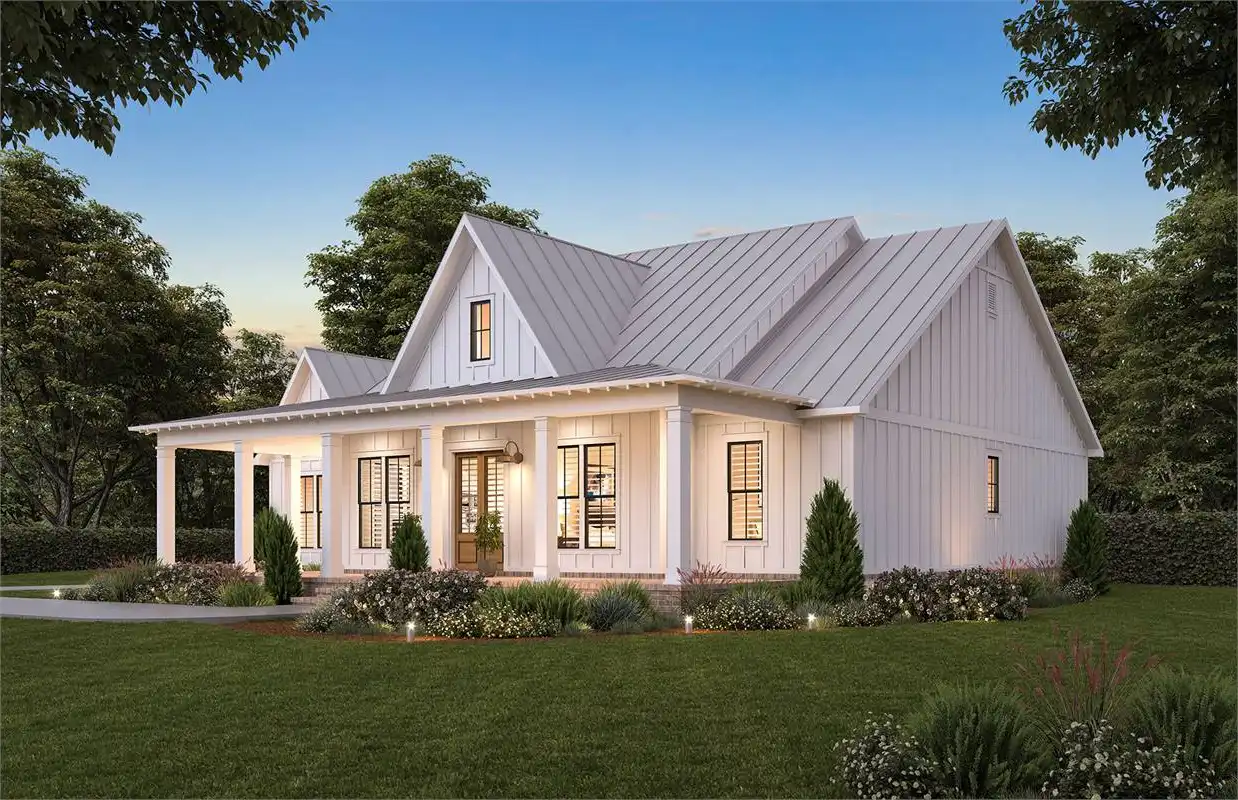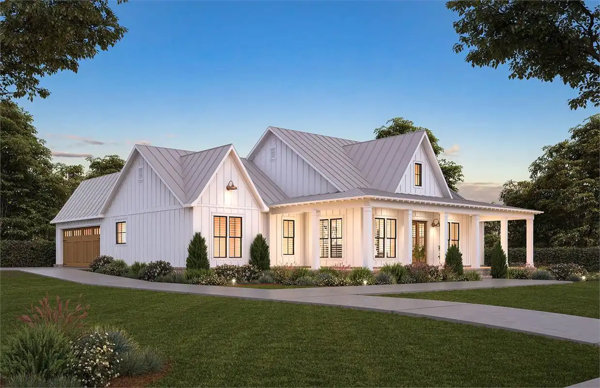 The Farmhouse design has never been more popular! Step inside the Farmhouse plan 5016 and find a gracious living room with an oversized opening to the kitchen. The prep island is the perfect space for creating meals and additional seating for when friends and family gather. In the great room, there's a vaulted ceiling and fireplace for ambiance, as well as plenty of space in front of it to enjoy your favorite show or movie on TV! You'll also love that this house plan comes with 3 bedrooms, 2 full baths, 1 half bath, plus an office/study with barn doors! And don't forget about all those windows throughout - they let in lots of natural light so every corner feels bright & airy.