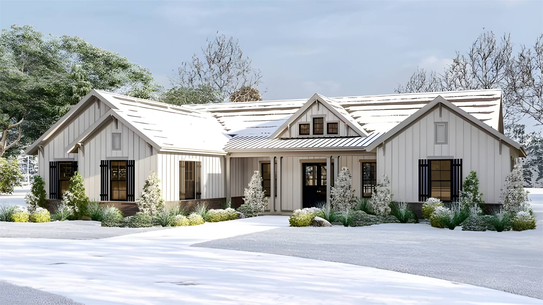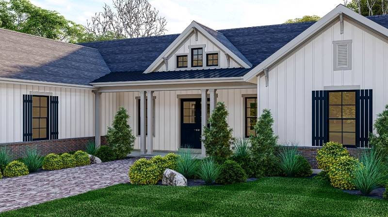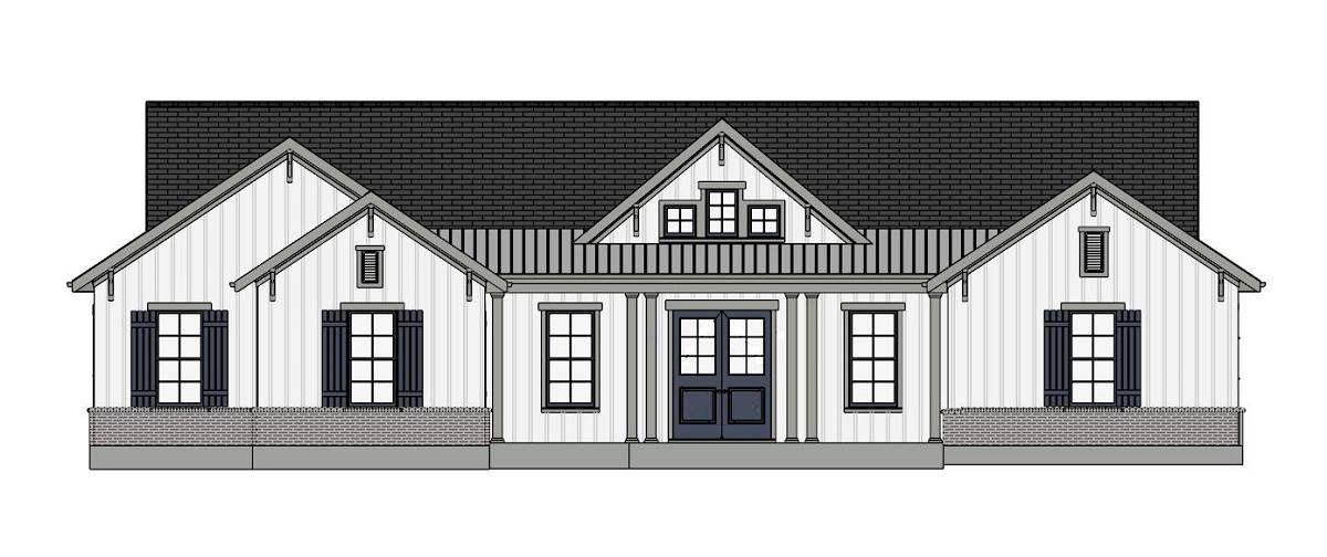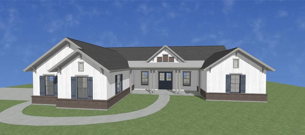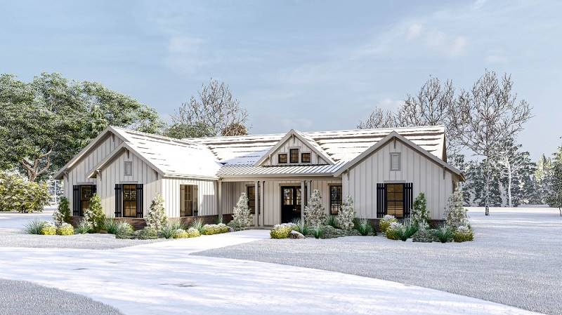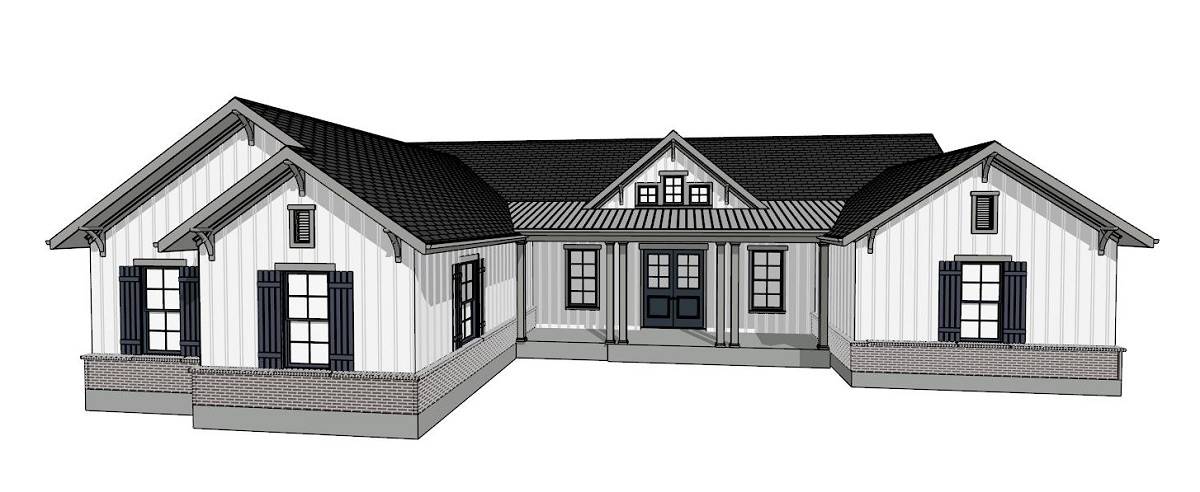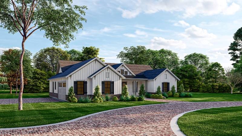 Need a beautiful country ranch? See if House Plan 5018 is the right fit! With 2,066 square feet, three bedrooms, and two bathrooms, it's the perfect size for most families. The layout places the totally open-concept great room in the center of the floor plan, with an island kitchen and dining area on one side and living space with a fireplace and a tray ceiling on the other. The primary suite enjoys privacy off the living area. The bedroom includes a sunny sitting area and a luxe bath that gives you the choice between a four- or five-piece layout. The other two bedrooms are placed in the hallway behind the garage along with a large laundry room and the hall bath.