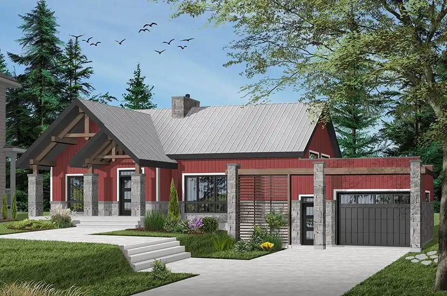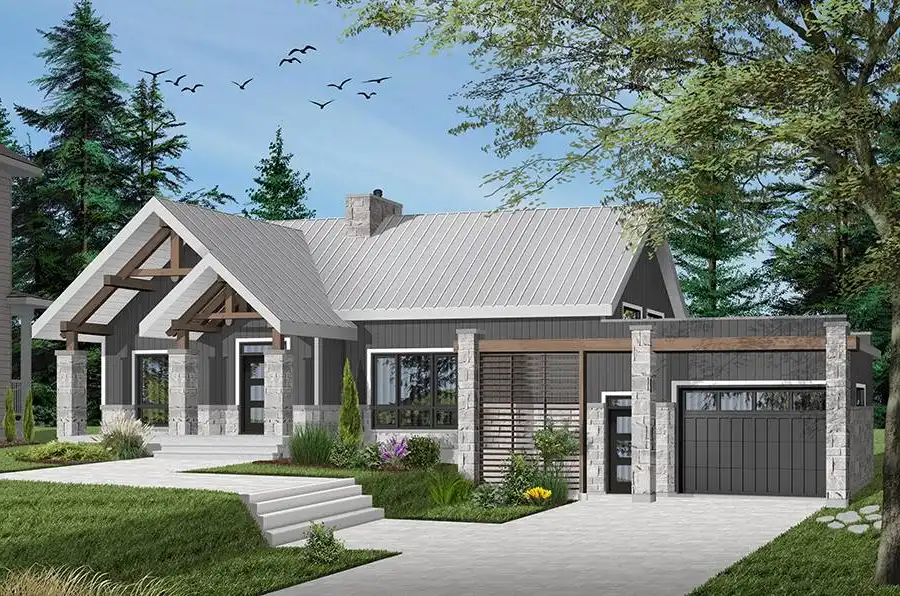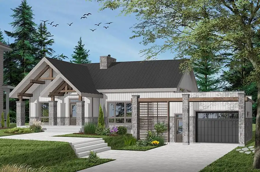 This farm house style offers 1,604 square feet of living space. In addition to its trendiness, this home is sure to fill you with a warm feeling and stands out quite brilliantly from other 1-story homes. Of Scandinavian inspiration, it also offers a surprising dining room and the triple window patio door will be sure to inspire nature lovers of all type as well as families. This plan also features 3 full sized bedrooms, one of which is the main bedroom with a big walk in closet. Inside, you will note the simple and pure contemporary style look. The home entrance offers a very practical and big closet, great for storage. The living room, kitchen and dining room form a spectacular open concept thanks to the cathedral ceilings of 16’ in height. The exposed decorative beams add even more style to this grand space that also leads directly to the covered exterior terrace and exterior kitchen via the three window patio door. Being completely covered, the terrace is without a doubt ideal for great gatherings with friends and family, especially during the warmer seasons rain or shine. This home’s exquisite triple window patio door will bring much natural light to the kitchen and dining room. Unquestionably having all the charms a cottage style home has to offer, this 4-season dwelling is the ideal choice for all those dreaming of a warm and coziness. The full bathroom with separate shower is located close to the master bedroom where you also have a private access outdoors to the terrace. Whether you are wishing to spend a warm and comfy winter season close to the fireplace, or an exciting summer out on the covered terrace look no more, this house plan is for you! An unfinished basement can also be later completed as your family needs evolve.
