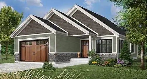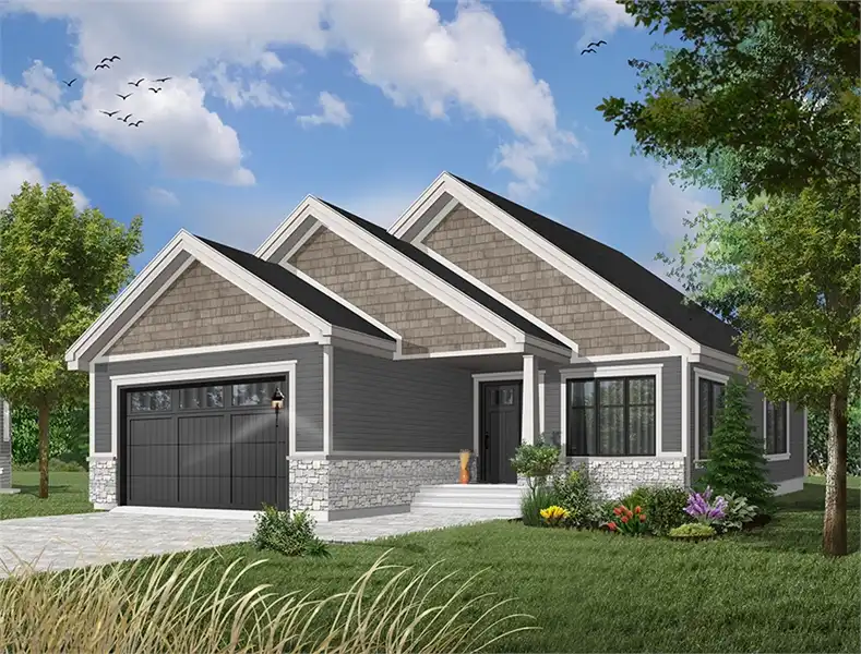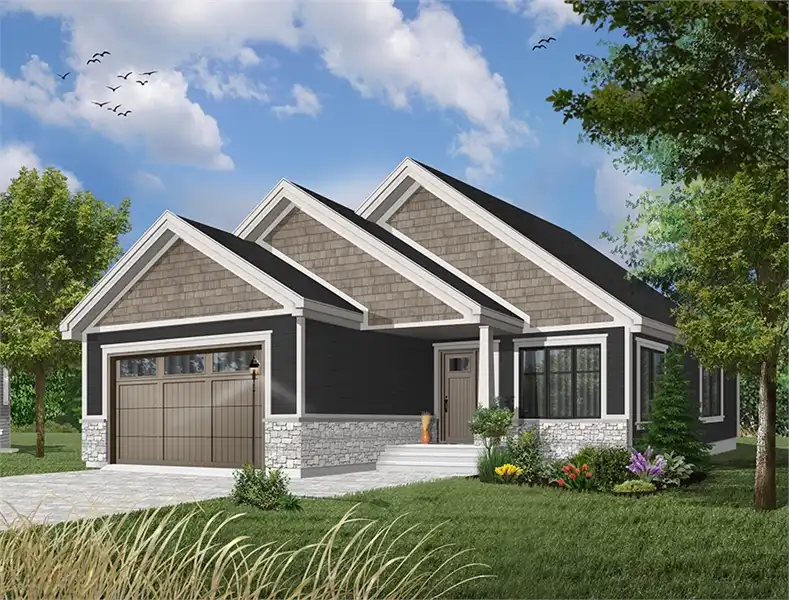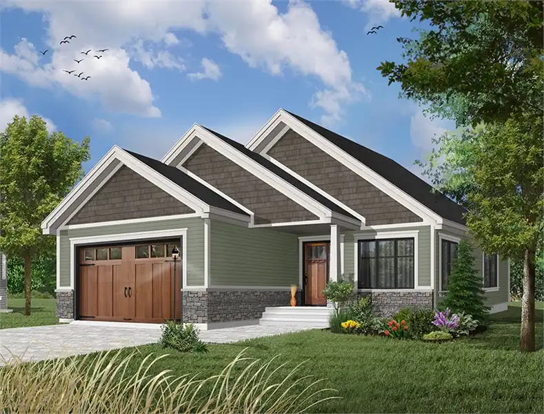 One story house plan with garage, ideal for a narrow lot. Of rustic-country style, this new house plan will be sure to please! For starters, the main entrance is closed off and also gives direct access to the garage area. Continuing past the main entrance into the main living area, a practical computer space can be arranged, or you can simply turn this