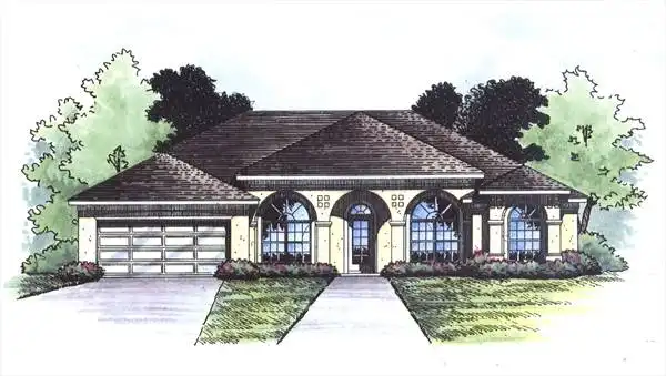 Repeated arches give this one-story home plan a Mediterranean feel. Inside, a corner fireplace enhances the spacious Great room. For more intimate conversations, choose the den/living room. The roomy kitchen serves any meal with ease. Can you imagine a more deluxe master suite than this one? The corner garden tub is sure to soak your cares away.