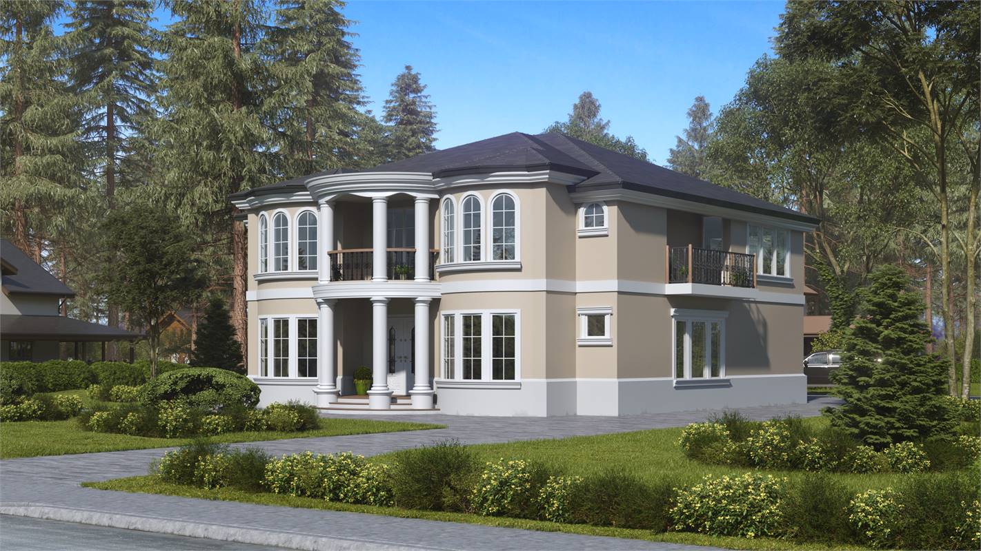 House Plan 5095 is a luxurious 5,141-square-foot home that transports to you a place where dreams are made. The curb appeal is undeniable with its majestic columns and distinctive windows. Entrance through the covered porch to a main hall with a grand circular staircase invokes images of dignity and luxury from a bygone era. The formal living room on your left is connected to the formal dining room and then to the kitchen, making serving your guests a breeze. The large U-shaped kitchen with an attached spice kitchen and pantry allows you to make gourmet dishes for family and friends. The first floor also boasts the open-concept great room beside the kitchen, a home office, a guest suite with private bath, and a powder room. Looking for the garage? You'll find it through the mudroom in back, where it has three bays with side entry. Upstairs, you'll find the family sleeping quarters that include an amazing primary suite with an ensuite bath, three secondary bedrooms each with their own three-piece bathrooms, a bonus room, the laundry, and a prayer room. But that's not all! Theres also a recreation room with the final bedroom and a full bath accessible from the exterior, up the stairs against the garage, to round out the unique features of this home.