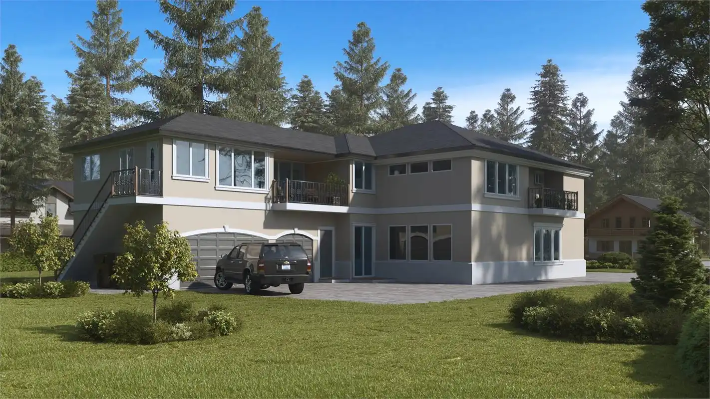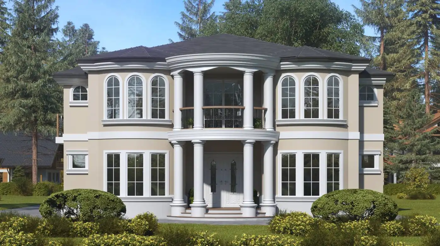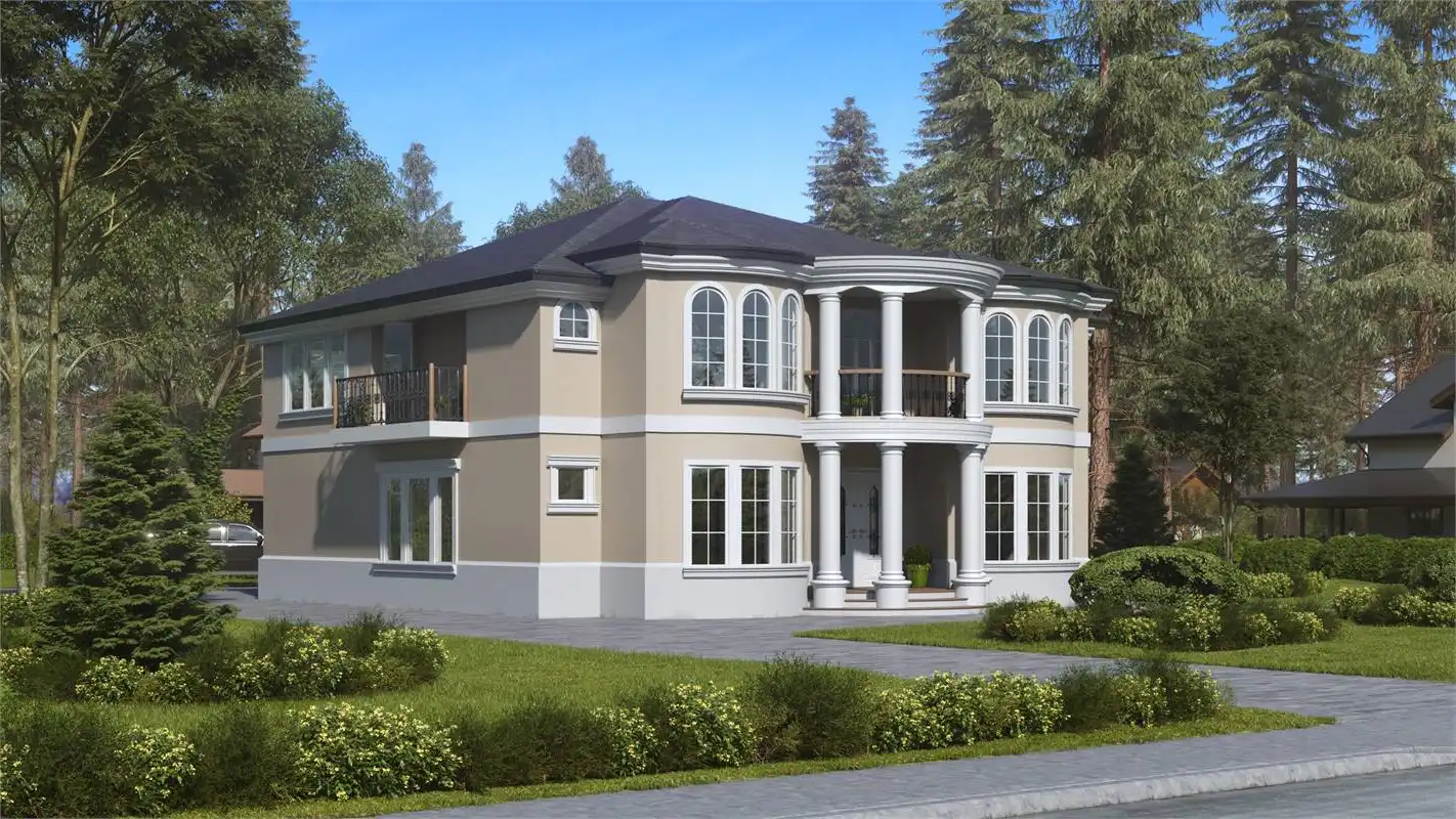 House Plan 5095 is a luxurious 5,141-square-foot home that transports to you a place where dreams are made. The curb appeal is undeniable with its majestic columns and distinctive windows. Entrance through the covered porch to a main hall with a grand circular staircase invokes images of dignity and luxury from a bygone era. The formal living room on your left is connected to the formal dining room and then to the kitchen, making serving your guests a breeze. The large U-shaped kitchen with an attached spice kitchen and pantry allows you to make gourmet dishes for family and friends. The first floor also boasts the open-concept great room beside the kitchen, a home office, a guest suite with private bath, and a powder room. Looking for the garage? You'll find it through the mudroom in back, where it has three bays with side entry. Upstairs, you'll find the family sleeping quarters that include an amazing primary suite with an ensuite bath, three secondary bedrooms each with their own three-piece bathrooms, a bonus room, the laundry, and a prayer room. But that's not all! Theres also a recreation room with the final bedroom and a full bath accessible from the exterior, up the stairs against the garage, to round out the unique features of this home.
