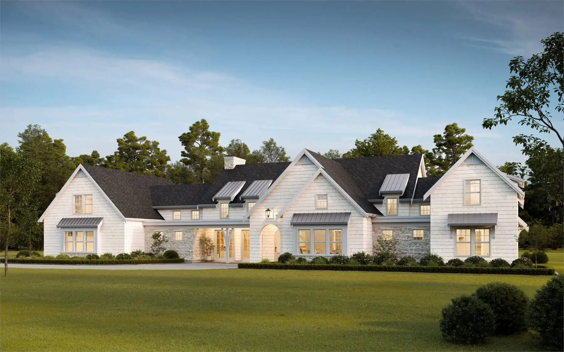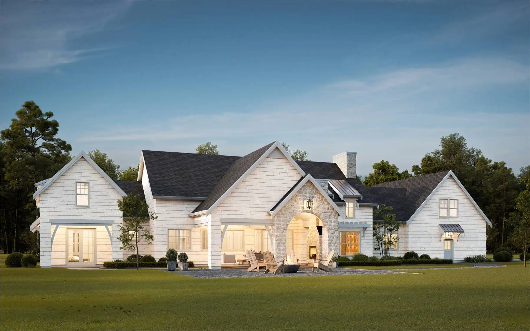 House Plan 5110 is a super spacious country design with 4,335 square feet, 5 bedrooms, and 4.5 bathrooms in a sprawling layout. The main level includes a cathedral great room with an island kitchen that opens to the outdoor lounge in back, the luxurious five-piece primary suite, a study beside a full bath, and a large mudroom coming in from the three-car garage. Two bedrooms and a hall bath are located up the stairs near the primary suite while the final two bedrooms and their hall bath are up the stairs in the mudroom. With all the bedrooms split apart like this, you can easily divide this home into different zones to give kids/guests their own space!