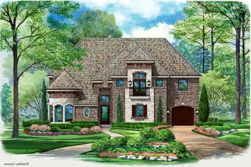 This luxury starter castle has three total alternative elevations, Fairfax Grove, Fairfax Ridge and Fairfax Valley. When you enter through this two-story foyer, your eyes are immediately drawn to the elegant dining room with direct access to the wine room. This estate house plan is very open, as you see when you enter. The quiet study has a bayed area, next to the large bank of windows up the 15' ceiling. The family gathering rooms consisting of the kitchen, dining room, and family room are open to one another, separated only by the free standing eating bar in the kitchen. The large bank of windows on the back of this luxury house plan has views onto the outdoor lounge. The master suite boasts a lavish master bath with separate shower and tub, his and her vanities, a large wardrobe and utility room. Access to the one-car garage is easily accessible from the master suite. A two-car garage completes this level of this luxury estate house plan. Upstairs three family bedrooms with full baths and walk-in closets flank the game room with built-ins and storage space. A media room completes this level of this luxury estate.