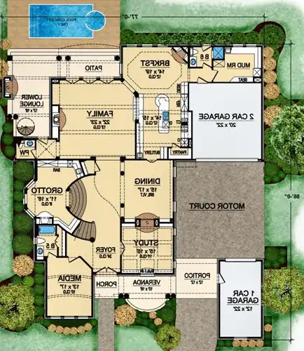 This Tuscan luxury mansion provides varied ceiling treatments throughout. The two-story foyer has a stunning view of the grotto. A quiet study shares a two-way fireplace with the formal dining room, and large decorative pillars define the perimeter. A media room with full bath is situated at the front of the house off the foyer. Beyond the grotto is the family room with fireplace and outdoor lower lounge and patio access. A spiral staircase in the lounge and warming fireplace adorn this area. The kitchen and breakfast area share a fireplace and free-standing island. The kitchen provides built-ins, a butlery and pantry in close proximity to the dining room for ease in serving. A mud room and powder room sit behind the two-car garage. Across the motor court is a one-car garage and portico that walks you to the front veranda. Upstairs, three family bedrooms with walk-in closets, full baths and trey ceilings, share space with balconies, a game room with bar, loft, upper lounge, built-ins and a reading room. The luxurious master suite boasts a bayed window with fireplace, trey ceilings, center dome, lavish master bath with his and hers vanities, separate shower, corner garden tub, and a large wardrobe with utility room, completing this Mediterranean luxury mansion house plan.