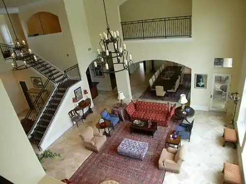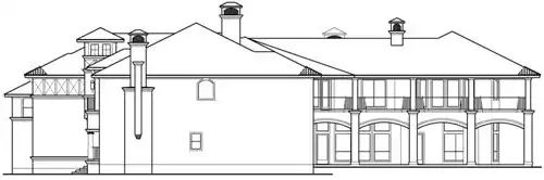 This Mediterranean luxury mansion house plan offers nine bedrooms! The motor court is flanked by two courtyard-entry garages; a four-car and a six-car. The two-story foyer is surrounded by the wine/bar room, stunning staircase to the second floor and a quiet study with warming fireplace and storage room. A family bedroom with walk-in closet, his and hers vanities, separate shower and tub sits in the rear of this plan. The living room and dining room are open to one another, and will both be warmed by the living room's fireplace and large bank of windows allowing the sun to stream in. The kitchen provides a free-standing breakfast bar to share with the breakfast area and family room. There area plenty of built-ins in the kitchen, as well as a large pantry. Three sets of double doors in the family room lead to the outdoor lounge with fireplace, surrounded by large decorative pillars that define the entire patio, lounge and verandas outside. A family bedroom with walk-in closet, storage and exercise room could double as an in-law suite. Upstairs, four bedrooms with walk-in closets and full baths share space with the game room, media room, reading room, storage spaces, and luxurious master suite. The master suite boasts a large sitting area, lavish bath with his and hers vanities, separate shower, garden tub, an office, his and hers wardrobes, and balcony access. Over the six-car garage is a two-bedroom apartment with two bedrooms, walk-in closets, two full baths, kitchen, breakfast area, den and laundry room, completing this Mediterranean luxury mansion house plan.