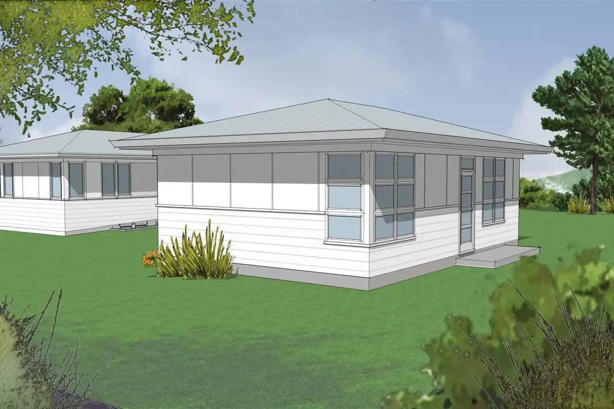 Sleek lines adorn this small, modern-style house plan, with one bedroom, one bath and 600 square feet of living space. Host a friendly gathering in the sizable living room of this home plan. A coat closet is a nice feature. The efficient kitchen includes a useful pantry closet. Serve any meals in the bright area nearby. Retire to the secluded bedroom at day's end, reading a book in the corner sitting area. A refreshing shower and a single sink are found in the cozy bath. Builders point out the home design's 9-ft. ceilings.