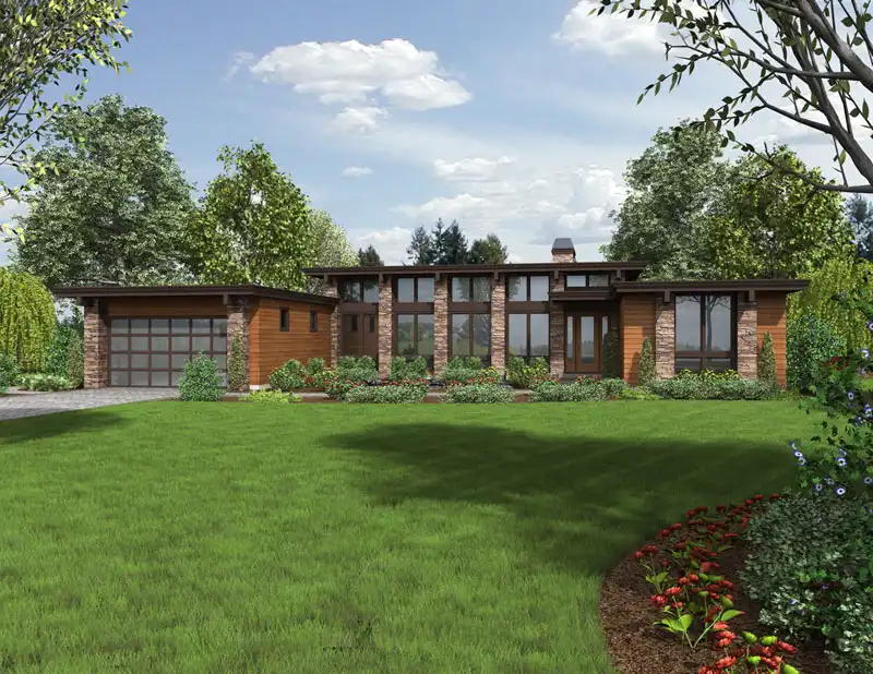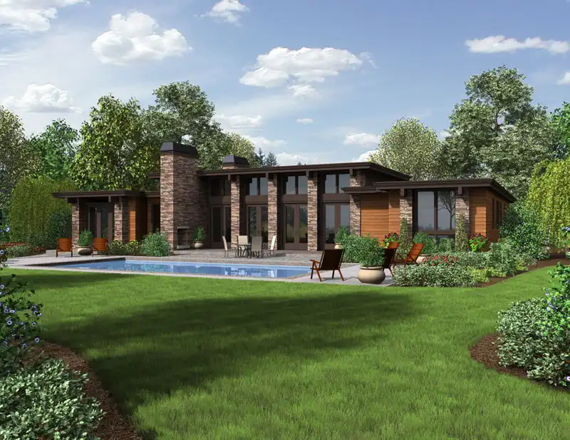Horizontal lines give a contemporary feel to this four-bedroom house plan, with 2.5 baths and 2,557 square feet of living space. Relax with friends in the living/dining room of this home plan, where a fire crackles in the fireplace. French doors offer direct access to a rear patio. The island kitchen boasts a handy pantry. Retire to the posh master bedroom after a long day. Features include a walk-in closet and backyard access. Refresh your body in the garden spa tub or the separate shower. You'll appreciate the two-sink vanity, especially on busy mornings. Two secondary bedrooms share a Jack and Jill bath in this home design. Builders point out the corner office, which would make a nice media room or extra bedroom.