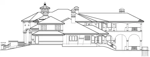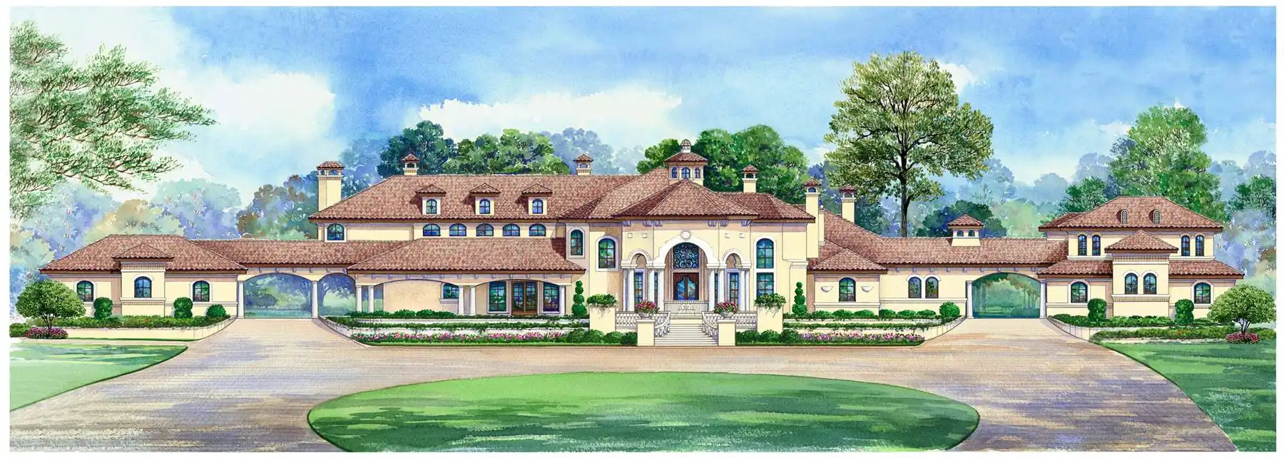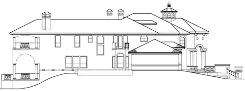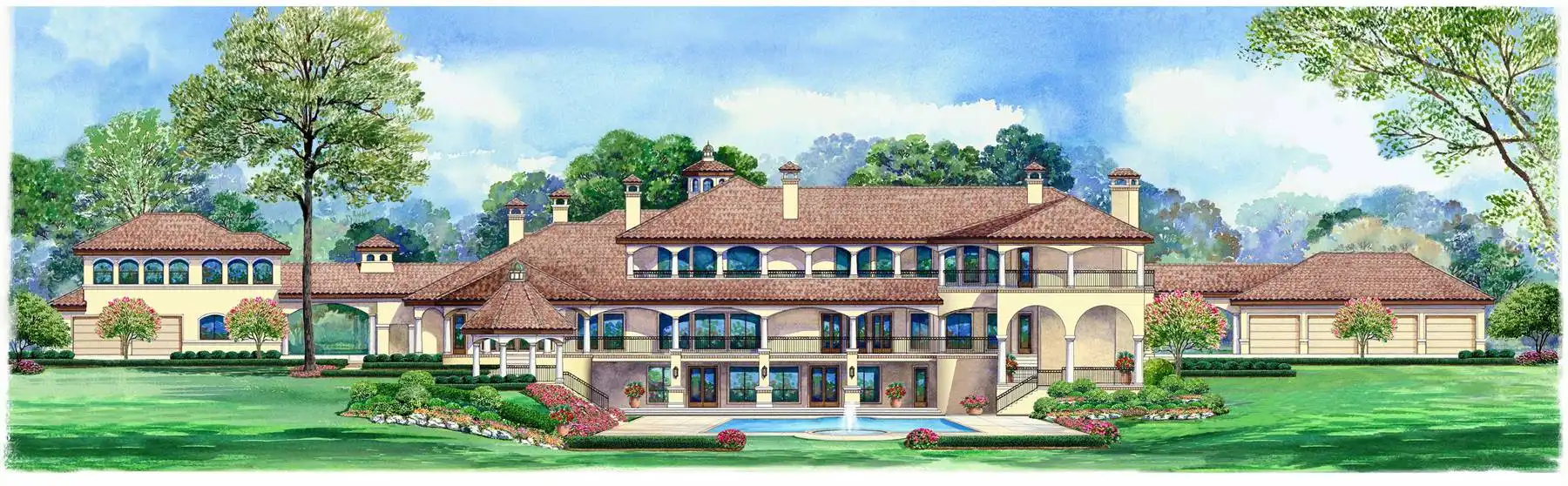 Breathtaking columns add warmth to a striking exterior. From the grand foyer, a point of focus is the living room, study and dramatic staircase. To the right, the island kitchen serves the breakfast nook, a keeping room, and spacious family room. Several fireplaces throughout warm the master suite, living room, family room, study and keeping room. Next to the living room is the master suite that boasts an oval shaped ceiling, a lavish bath with large garden tub, separate shower, his and hers vanities, a bar and large his and hers wardrobes. A cozy fireplace and access to the veranda for outdoor relaxation, add to the ambiance. Upstairs features the many two-story areas, from the foyer's ceiling to the living room's coffered ceiling pattern. Outside enjoy the gazebo, rotunda, terraces and concept pool. A game room, outdoor breakfast area and pavilion are just some of the amenities to this luxury mansion home plan. Three family bedrooms, three full baths, a den, and plenty of outdoor sitting and overlook completes this luxury mansion home plan.