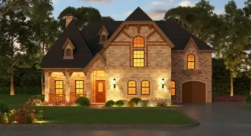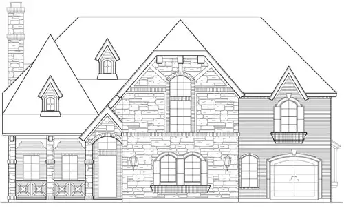 Feel right at home as you walk into this stunning European luxury mansion. The two-story foyer opens to a family vestibule with corner lounge, niche, and stairs to the second level. The large decorative pillars define the elegant dining room. Access to the pantry and kitchen offers ease in serving meals to family and guests. Through the barrel vault off the family vestibule, the family room with corner warming fireplace and built-ins offers streaming sunlight through its bank of rear windows. The breakfast area leads to the outdoor lounge and is part of the kitchen and family room. A free-standing island and breakfast bar add counter space to this gourmet kitchen. The spacious master suite boasts a large master bath with his and hers vanities, separate shower, tub and large wardrobe. A door from the wardrobe leads to the utility room, study and the one-car garage. A front family bedroom with large walk-in closet, private full bath, and veranda views, can be converted to an in-law suite. A two-car garage completes this level of this mansion house plan. Upstairs, three family bedrooms offer walk-in closets and private, full baths. They share space on the second level of this European luxury mansion house plan with a bar, equipment room, game room, media room, and loggia for overlook views to below.