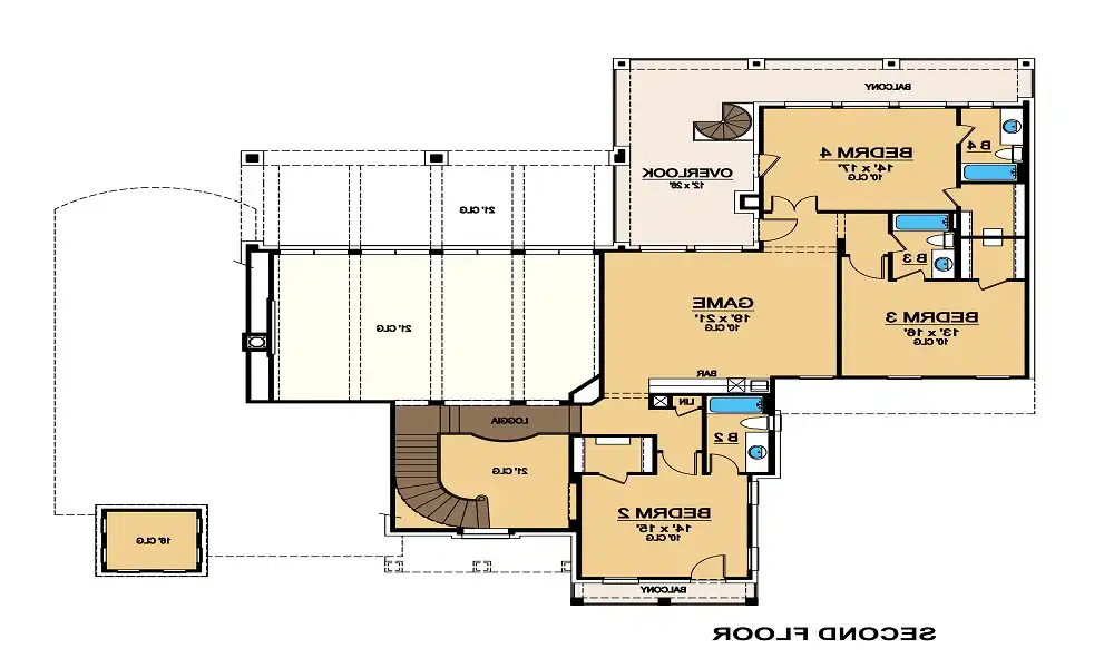 This luxury mansion house plan opens to a lovely two-story foyer with curved stairs to the second level. A formal dining room with butlery offers ease in serving. The family gathering area consists of the kitchen, breakfast room and family room. The family room's center warming fireplace is flanked with built-ins and helps keep this area cozy. Access to the outdoor lounge can be achieved through the family room. The gourmet kitchen provides a free-standing island for additional counter space. The breakfast bar can be shared with the family room and breakfast area. The large master suite has a bayed window sitting area and access to the outdoor lounge, lavish master bath with his and hers vanities, snail shower, corner garden tub, and large his and hers wardrobes. Upstairs, three family bedrooms with walk-in closets and full baths share space with a game room, balcony, and overlook. A circular staircase from the overlook will take you back to the first level, or stay and enjoy the stunning views to the main level below, completing this luxury mansion house plan.