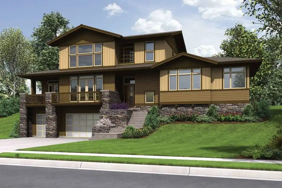 For those who love the look of a modern home with some contemporary touches, this house plan is for you. Boasting 2,754 square feet as well as 3 bedrooms and 2.5 baths, this home feels even larger than it actually is, thanks to the thoughtfully designed floor plan. For those who love to garden or landscape, you’re in luck, this home offers several built-in planters along the front walk up and in the back. The front door gives way to a stunning 2-story great room that opens on to a front deck. Off of the great room is a kitchen with one of the most beautiful islands that you have ever seen. This plan also offers a master suite with gorgeous windows and an equally beautiful master bath. With a 3 car garage in the lower level and 2 bedrooms on the upper, this home is sure to have enough space for everyone.