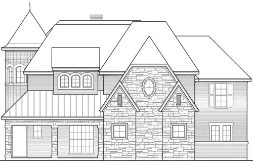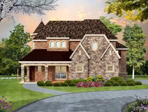 This elegant luxury house plan offers a first story master suite, complete with a luxurious master bath with garden tub, his and her vanities and plenty of closet space. The family room has a warming fireplace and an openness with the dining room, kitchen and breakfast area. The round pillars between the dining and family rooms offer a majestic feel. A den off the breakfast area has easy access to the outdoor lounge. Up the winding stairs, one will find two family bedrooms with a Jack and Jill bath, game and media rooms, and a fourth bedroom with bath. The second story offers views to the main level below.