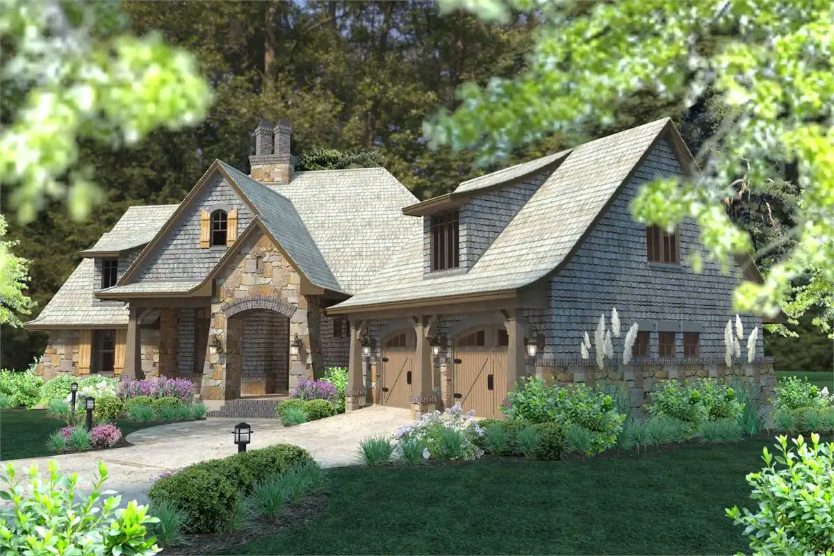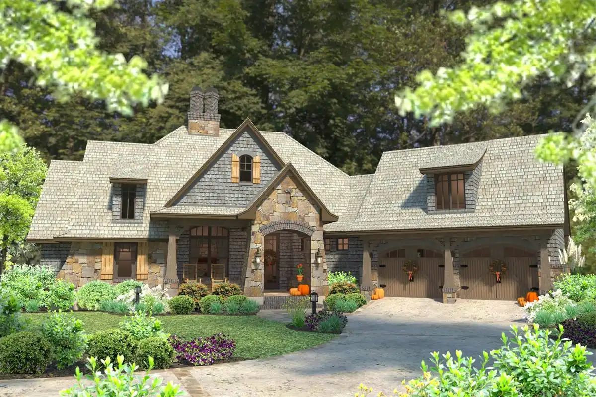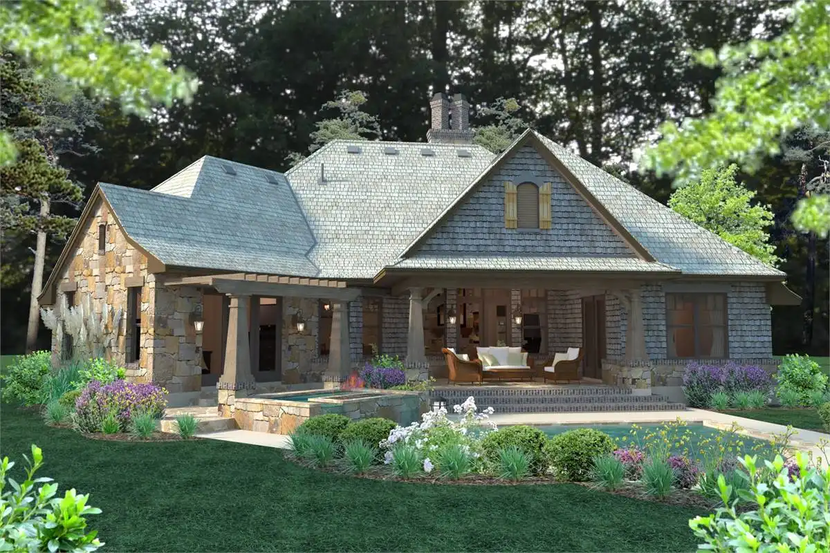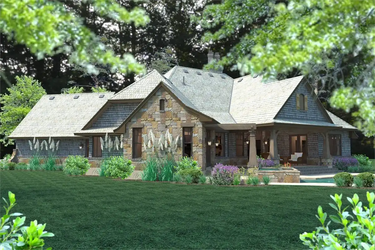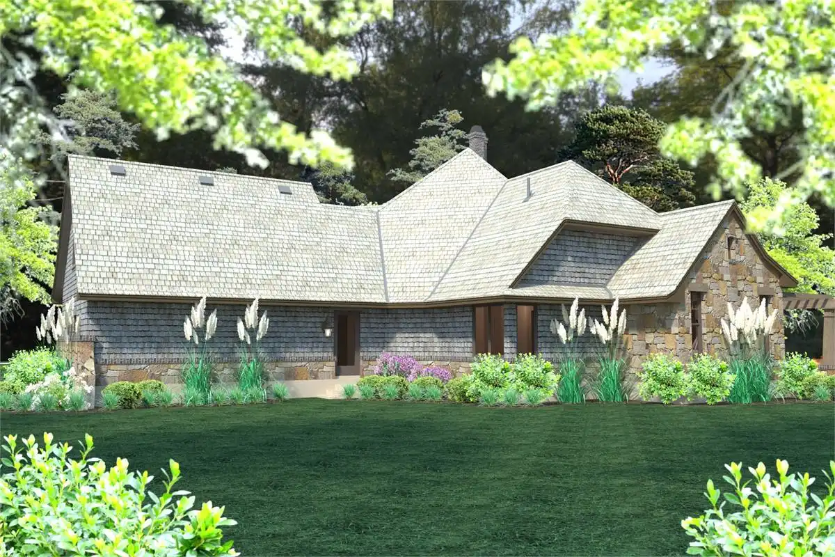 Shutters and stone accents lend a French country appeal to this house plan, with four bedrooms, 3.5 baths, 2,482 square feet and an additional 473 square feet in the bonus room. Visitors will love the inviting front porch of this home plan, as you welcome them and show them to the vaulted family room. A two-way fireplace is shared with the vaulted dining room. The island kitchen shows off a bright nook and a corner pantry. Beyond double doors, a cathedral ceiling presides over the secluded master suite. Note the suggested trellis and hot tub in the backyard. In the private bath, you'll find a sun-drenched tub, a separate shower and a dual-sink vanity. Don't overlook the fabulous walk-in closet, which could open directly to laundry facilities. Three secondary bedrooms boast convenient bath access. Our customers love the rear lanai, and the quiet study or home office in this home design. Above the two-car garage, the bonus room would make a nice playroom for the kids.