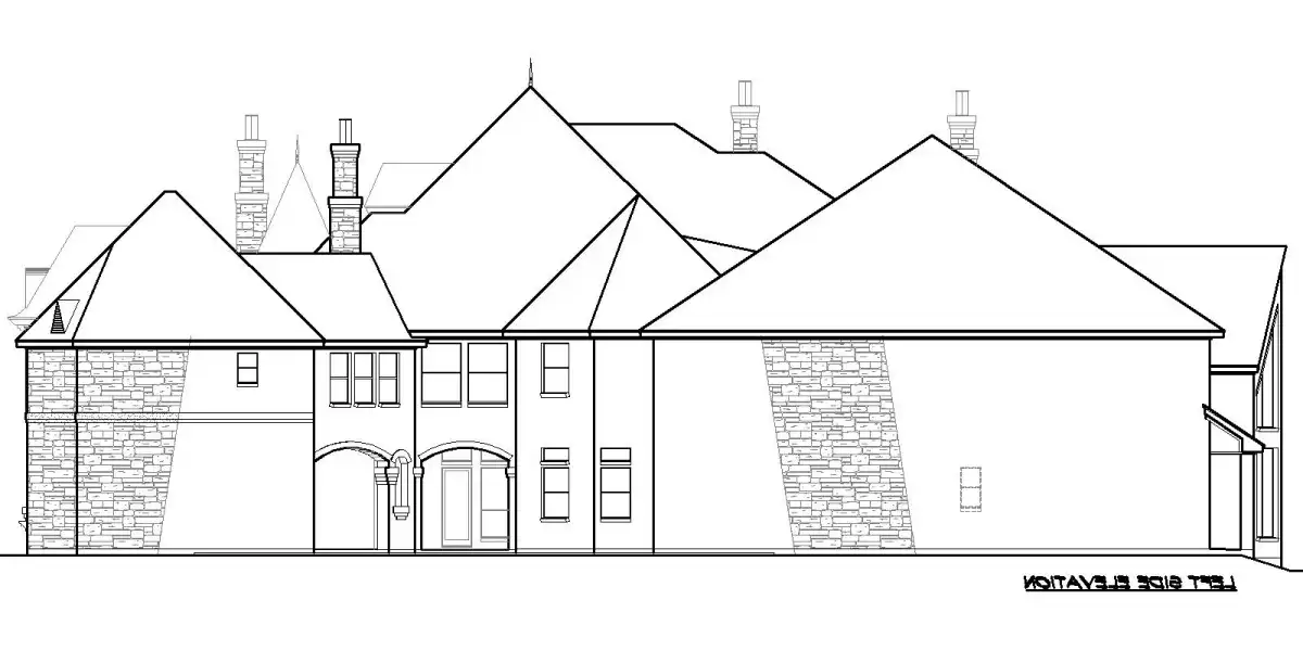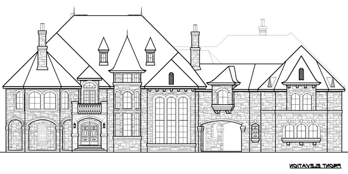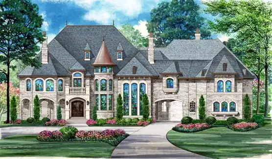 Family and friends will enjoy the large patio with a fireplace, veranda, and guest suite balcony, inviting hours of entertaining for family and friends. The master suite is on the main floor and provides peace and quiet with, boasting a fireplace separating the master suite from the sitting area, a gym, and access to the patio. The lavish master bath has his and hers vanities, a center tub, separate shower, his and hers large wardrobes with a safe room. The kitchen serves the dining room through the butler's pantry. The circular breakfast area has plenty of windows that allow the sun to stream through the windows from the patio. Enjoy the view with your morning coffee. The first level also features a billiard room, mini office, living room with music area and, a study with two entrances to the veranda that flank the warming fireplace. The second floor offers three family bedroom suites, a trophy room, game room, media room, lounge, loggias, plenty of storage and balconies, completing this two story luxury mansion chateau. Steep roof lines and plenty of windows create an elegant appeal for this luxury mansion chateau.