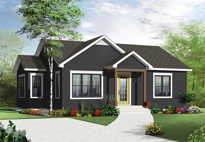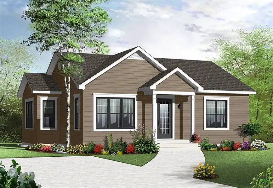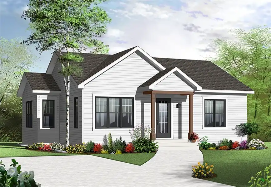 Simple Living! Affordable starter house plan! A mere 880 square feet is thought of as small for a house but this sweet bungalow provides elbow room compared to a condo! An open concept makes this space seem larger than it is and you have the benefit of owning your own space entirely. A bright dining area is nestled into its own alcove and opens directly to the back yard. The living room feels more expansive thanks to an open staircase. Two bedrooms share an efficient bathroom. If you need more space for living or storage, you have the option of doubling your living space by developing the basement or you could enlarge the main level living area by selecting a crawlspace foundation.