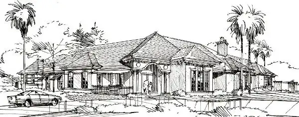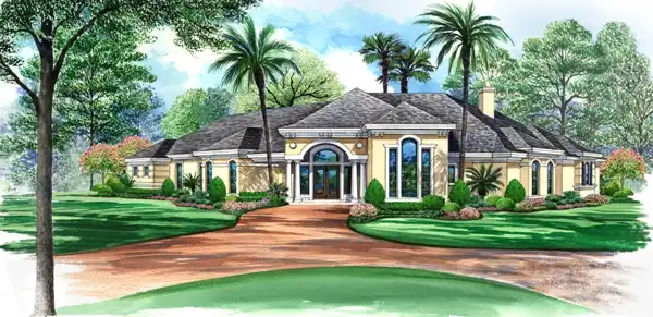 Interesting ceiling detail throughout adds to the architectural value of this design; whether it's trey, vaulted, barrel vault, or coffered, all these styles enhance the height and size of these rooms. The foyer opens to a large living room with its large bank of windows and door that leads to the terrace. Large decorative pillars surround the lanai and terrace. Off the living room through French doors is the quiet study with built-ins. A formal, elegant dining room lads into the kitchen and pantry for ease in serving. The large kitchen breakfast bar is shared with the family room and breakfast area. The breakfast area has a built-in hutch to store your favorite dishes and crystal, while the family room offers built-in bookcases, a warming fireplace, and French doors to the lanai. Two private bedrooms with private baths and walk-in closets share this rear wing with a utility room and one-car garage. Outside the elegant master suite is a bar, so grab a glass of wine come on in. The bayed sitting area in the master suite offers an open view to the great outdoors. A quiet retreat offers an entrance to the outdoor (concept) pool area, a private bar, a lavish bath that boats his and hers vanities, separate shower and garden tub, and large wardrobe complete this luxury mansion house plan. This Mediterranean luxury mansion house plan has a wonderful flow for family living. Make it yours !
