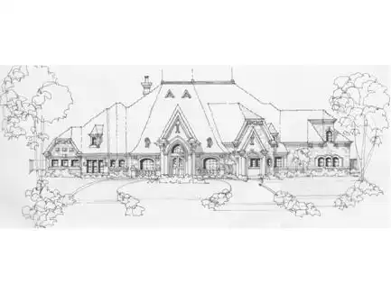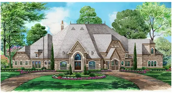 Through the portico and double doors into the foyer, the stunning rotunda will catch your eye. The foyer is flanked by a cozy study and an elegant dining room, both with veranda views. Direct access to the butlery, pantry and kitchen offer ease in serving family and guests. The kitchen has a free-standing island and a breakfast bar to share with the living room and breakfast area. The breakfast area has a corner fireplace and access to the patio, while the living room has built-ins, a warming fireplace, and large, decorative pillars that serve to define the perimeter of the living room. Two family bedrooms with walk-in closets and full baths flank the game room with built-ins. A guest suite is perfect for in-laws, boasting a large guest suite with sitting area and a lavish bath with separate shower and tub. The master suite is next to the gym. The master bath boasts his and hers vanities, separate shower, tub, and a wardrobe with built-in safe. A four-car garage completes this level of this European luxury mansion house plan. Upstairs, a huge bonus room shares space with a gallery and full bath. Feel right at home as you walk into this stunning European luxury mansion house plan.