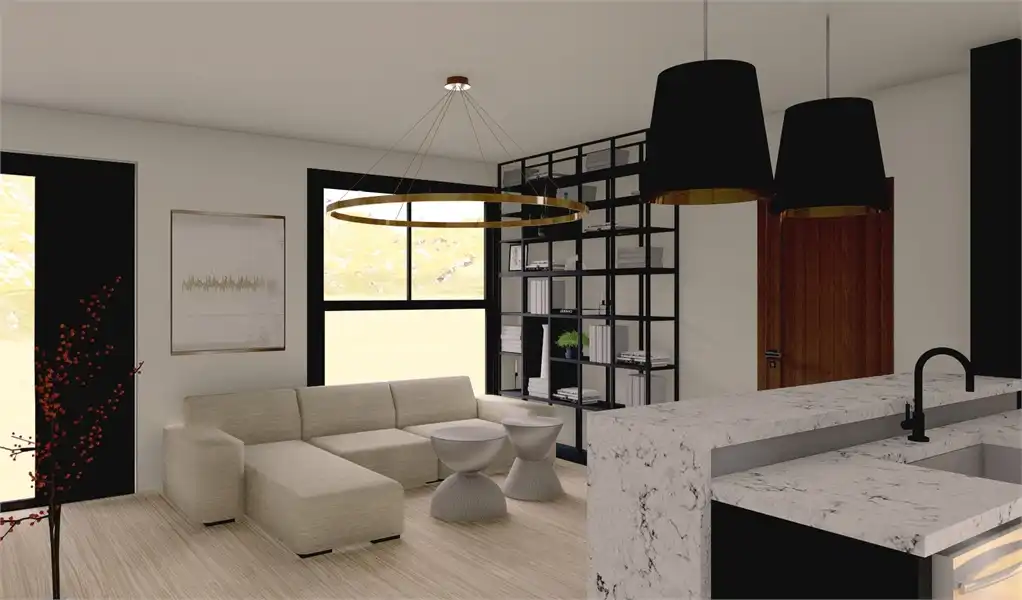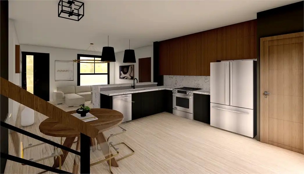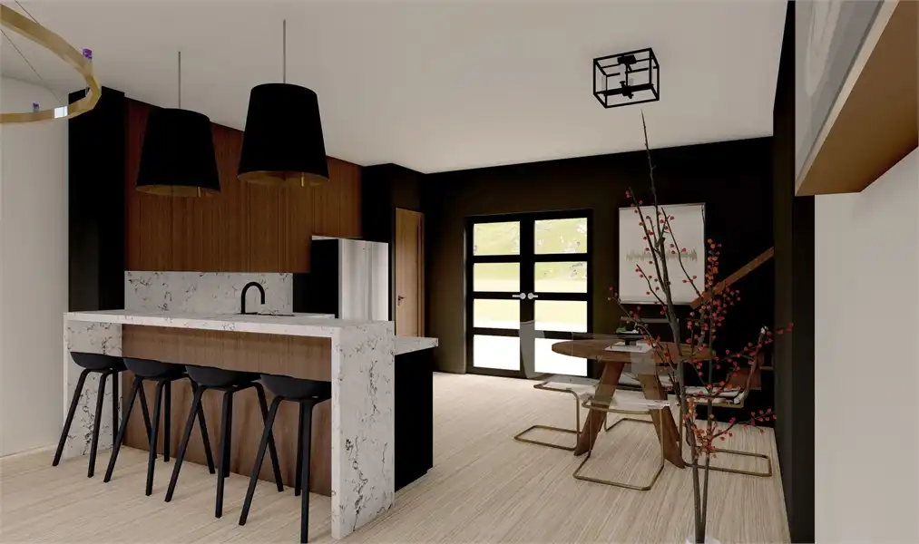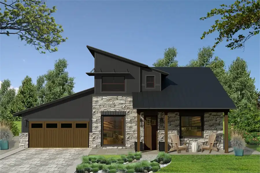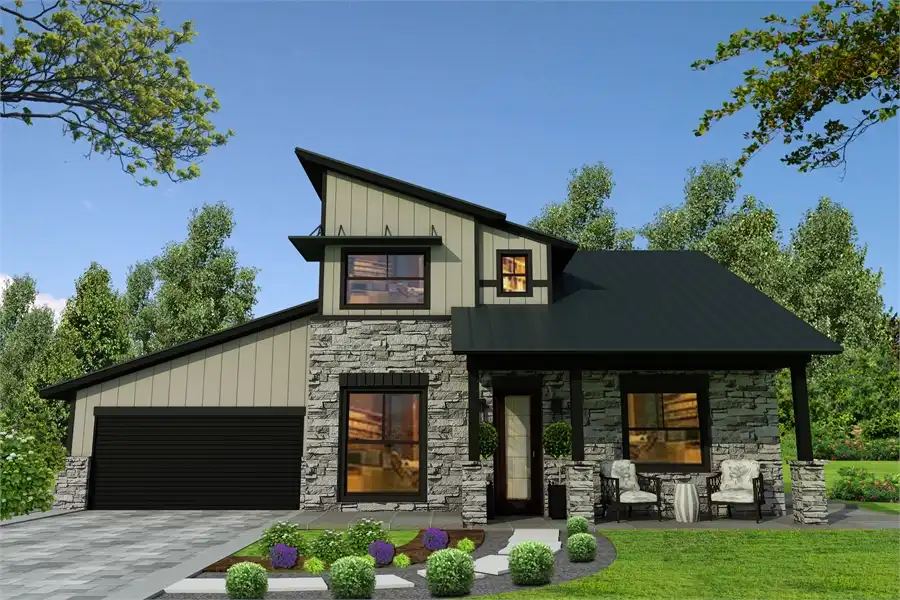 The Greenview,’ a customer favorite. The Raven incorporates new modifications based directly on feedback from our customers, so this plan is ready with all of the updates. Stone cladding and vertical vinyl siding adorn the exterior, while a sloping, dynamic roofline catches the eye and offers the contemporary style has become so desirable. An attached two-car garage provides ample space for this home to comfortably provide for a working family in any environment. For lovers of outdoor living, a small ground-level patio and second-story deck help you kick back at the end of a long day. The interior of The Raven showcases a modern open floor plan, featuring great things such as a peninsula kitchen with bar seating to increase the functional space. The Raven offers 1,603 square feet of living space, full of great benefits at every turn. The kitchen can also host a dining table for a proper meal, while patio doors open on to the back deck, taking the headache out of hosting guests. An addition to the original plan, The Raven now features a half bathroom on the main level to accommodate guests. The main-level master suite also features an updated bathroom layout, complete with his and hers vanities and a large walk-in shower positioned for gorgeous natural lighting. The toilet is tucked away in a water closet for more privacy, while a spacious walk-in closet will easily accommodate any wardrobe. Upstairs is home to two more bedrooms and a full bathroom, as well as the laundry room, making chores convenient. Kids and parents alike will enjoy the roomy second floor loft that opens to the upper deck. This space is great for any variety of uses, from a second living room, game room, exercise room, or whatever else you desire! We’ve included a suggested list of our tried and trusted products in the floor plan and listing below so you know what we used to design The Raven. These Architect Preferred products were used in the finished renderings. If you like this Customer Preferred House Plan but want more outdoor space, check out