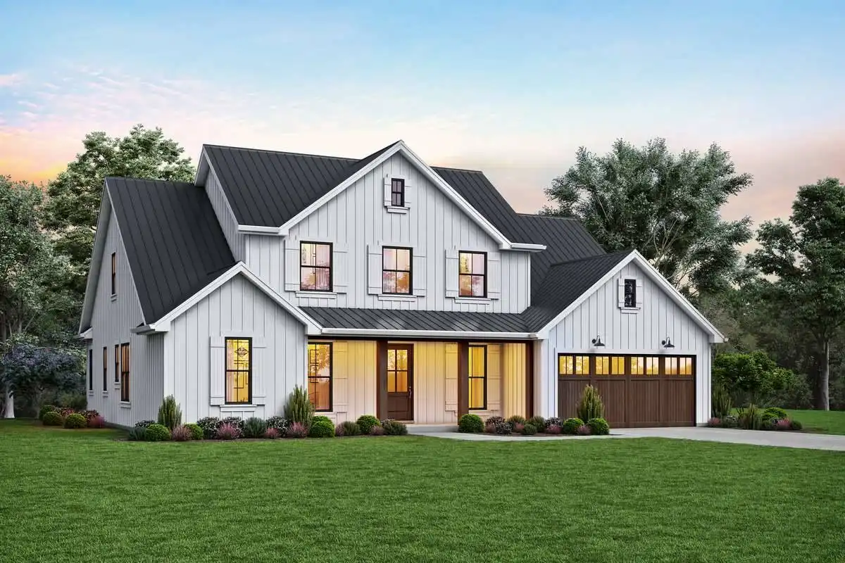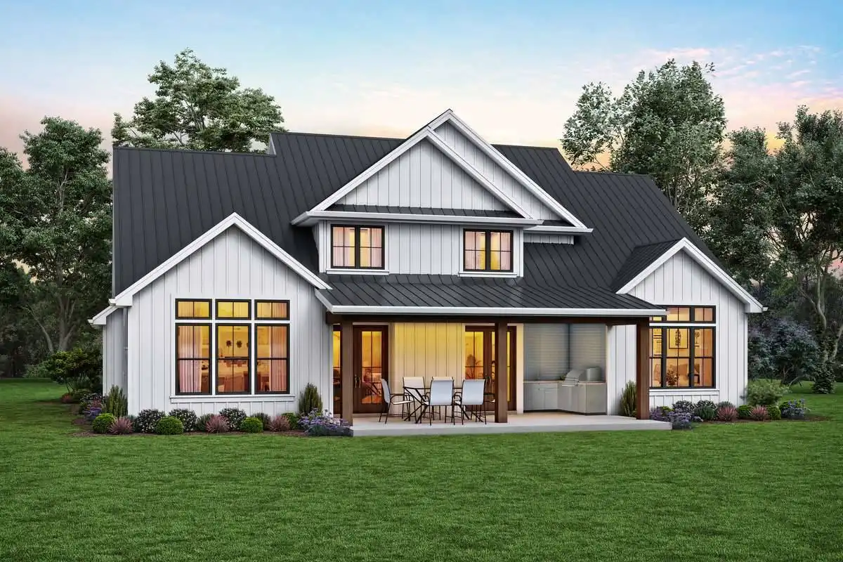 Symmetrical designs and appealing style gives this 2-story modern farmhouse plan a ton of curb appeal. That is only the beginning though, as you move past the 2-car garage and covered porch to reveal a totally open and inclusive, 3,032 square foot layout. This includes 4 large bedrooms and tons of other great spaces. Notice how the first floor seamlessly joins the great room, kitchen, dining room, and even the covered porch and grill station, all together as one. You'll also enjoy the private study and the first-floor master, both offering a bit of productivity and relaxation respectively. Upstairs finds 3 more bedrooms, including a fully stocked guest suite, perfect for visitors and kids alike.