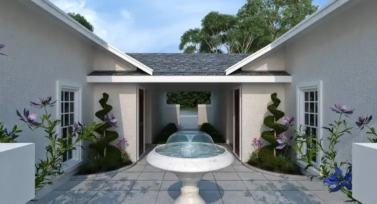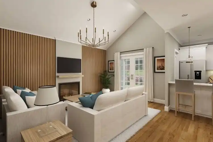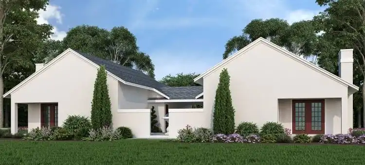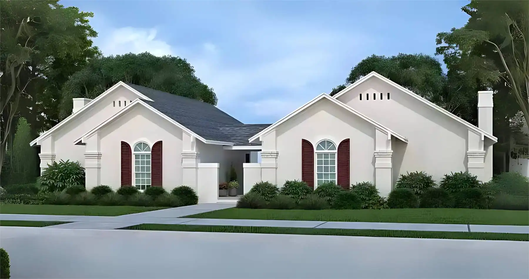 The design of this duplex plan offers a great solution for those seeking a home for themselves plus rental income live in one unit and rent out the other. They also make great retirement homes or the perfect solution for those who are attending to elderly parents. The exterior is especially designed to create the look of a single-family home. The central courtyard makes an impressive focal point of entry while the covered rear porches provide a private outdoor living space. The living room is bright and open to the kitchen and dining and includes a wood burning fireplace and sloped beamed ceiling. A walk-in master closet, twin secondary bedroom closets, an entry closet and a built in kitchen pantry provides abundant storage. A separate garage plan is available as an option.